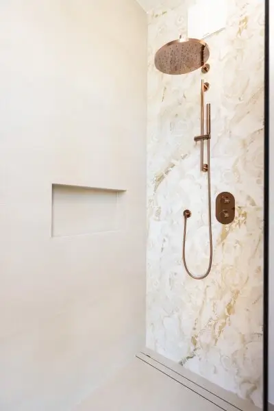 In Bädern und auf Terrassen kommt großformatiges Feinsteinzeug zum Einsatz: