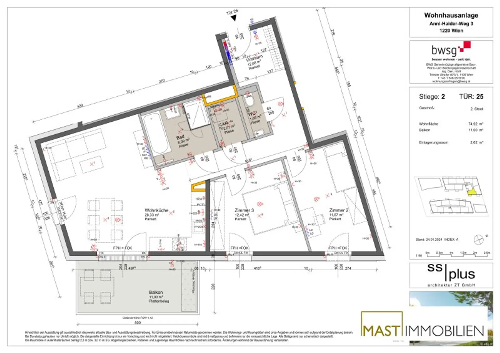 Die Wohnung befindet sich im 2. OG und verfügt über 74,92 m² Wohnfläche + eine 11 m² große Freifläche.