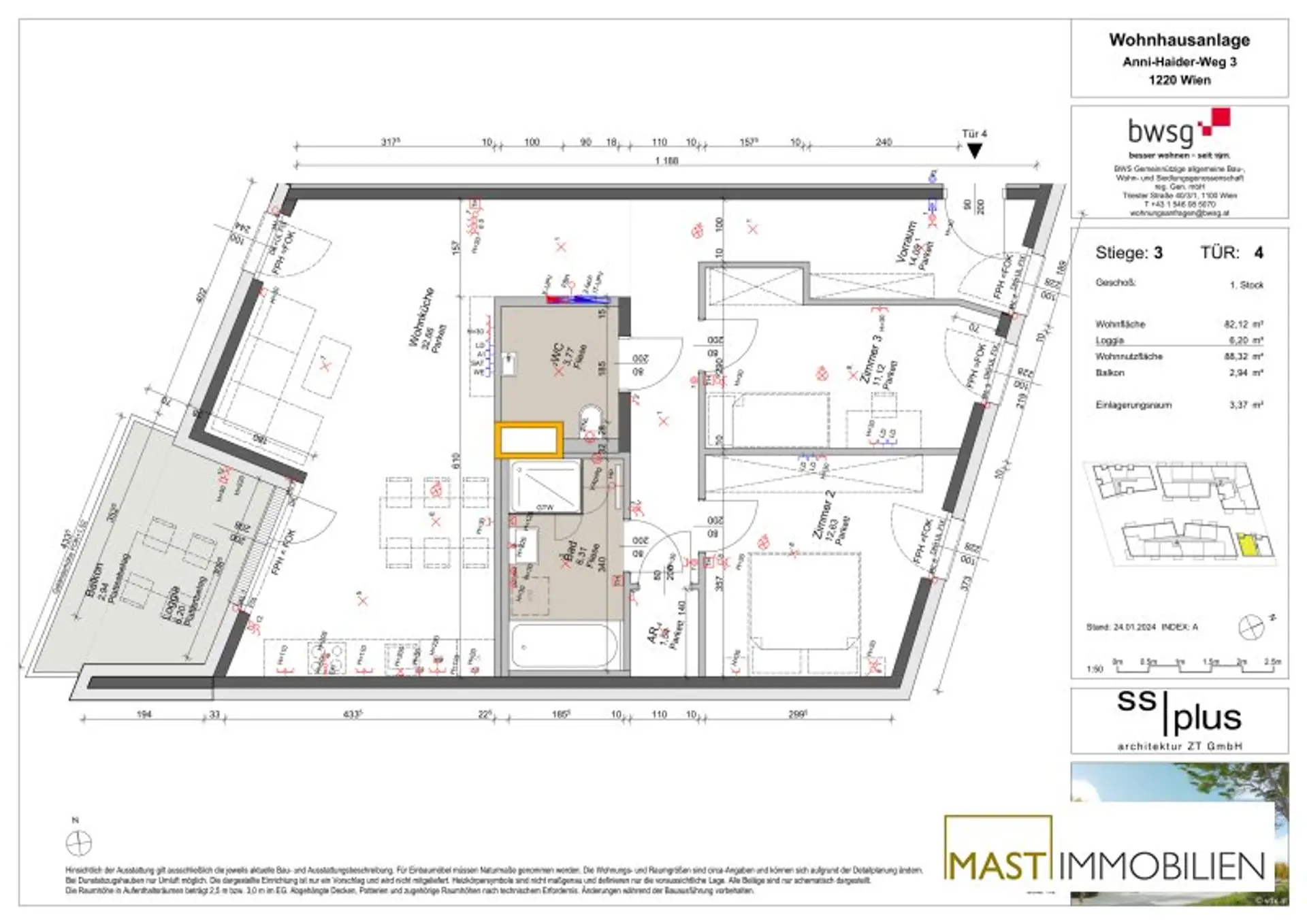 Die Wohnung befindet sich im 1. Obergeschoss und verfügt über 82,12 m² Wohnfläche + eine 9,14 m² große Freifläche.