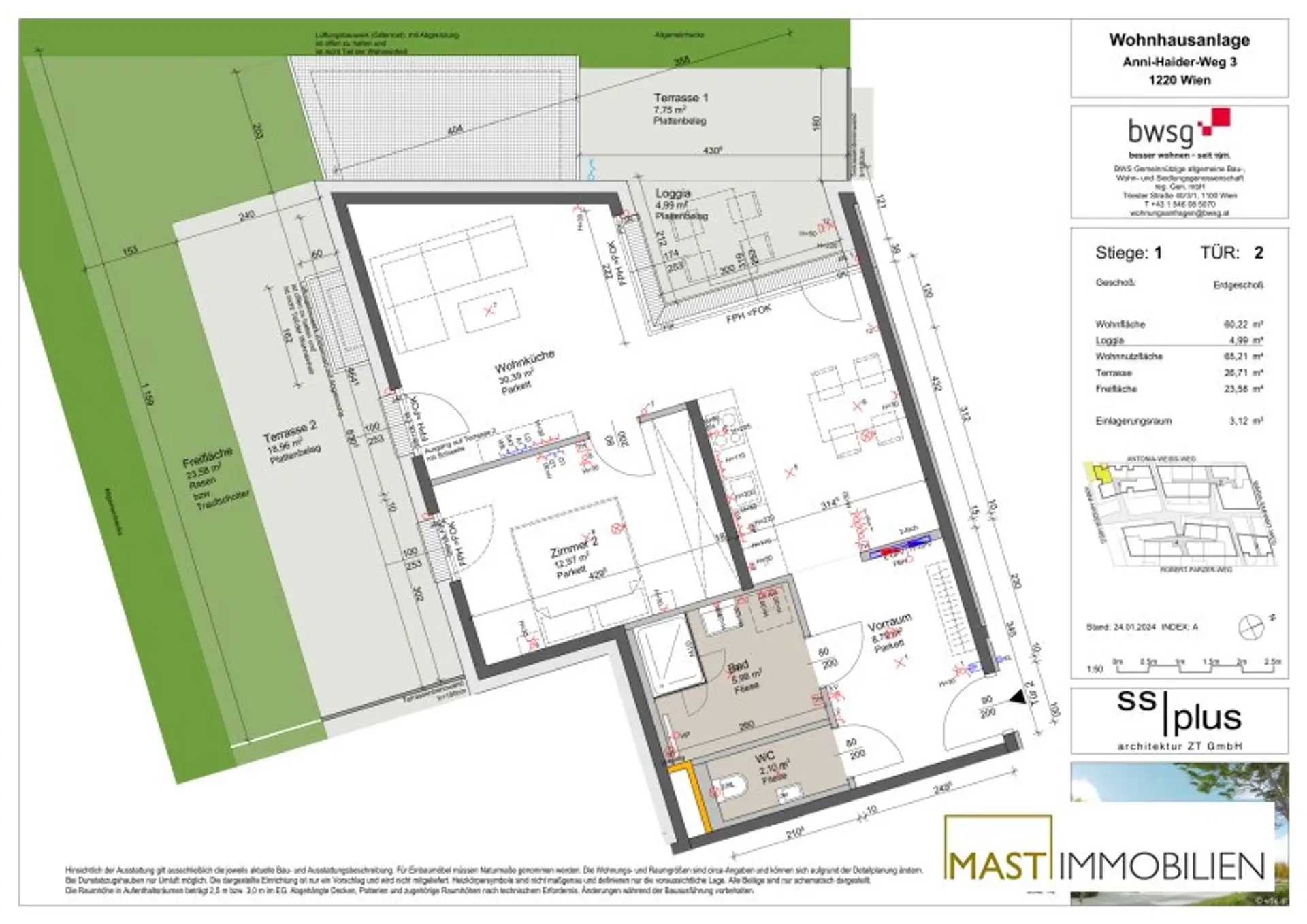 Die Wohnung befindet sich im Erdgeschoss und verfügt über 60,22 m² Wohnfläche + einen 55,28 m² große Freifläche.