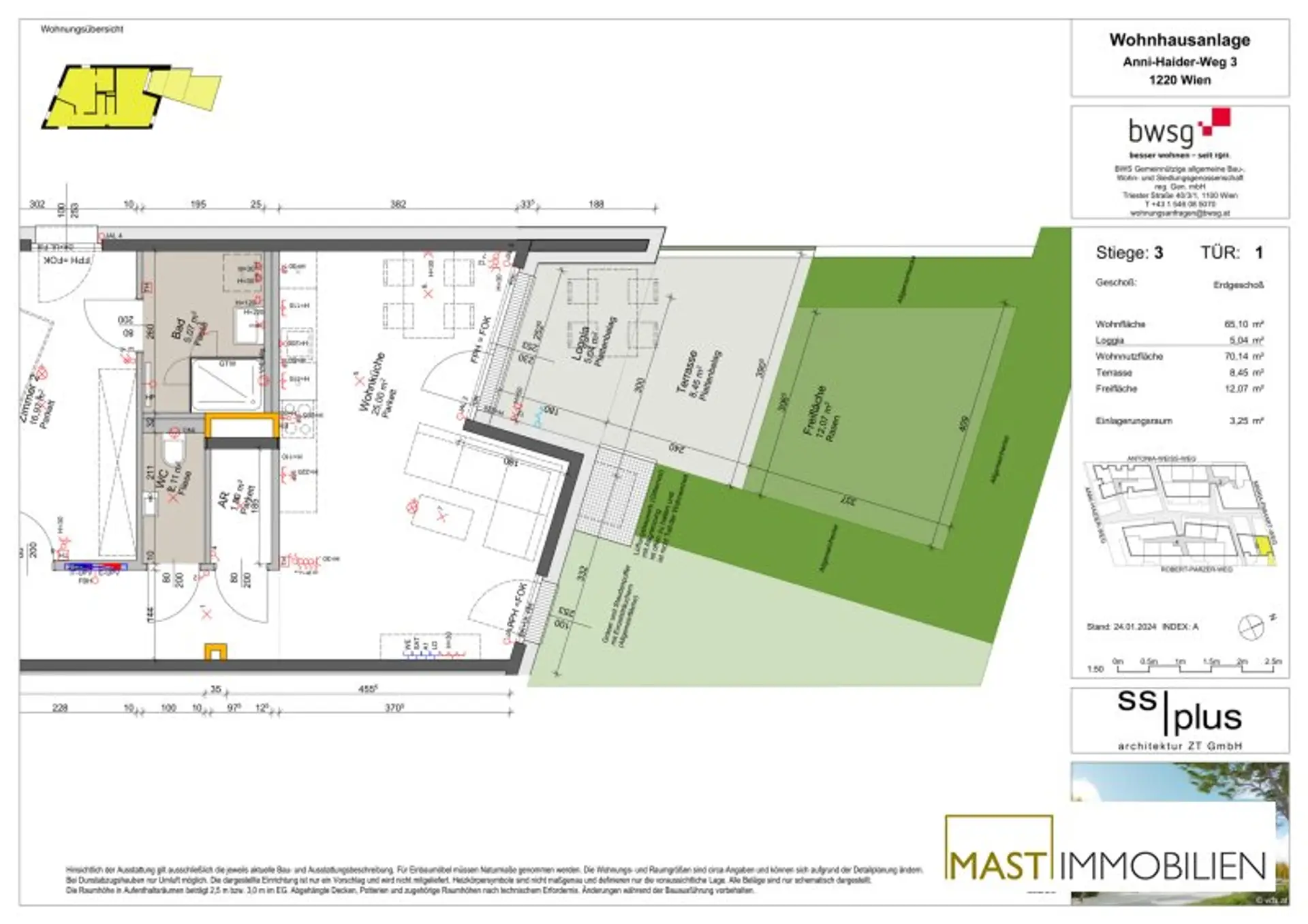 Die Wohnung befindet sich im Erdgeschoss und verfügt über 65,10 m² Wohnfläche + eine 25,56 m² große Freifläche.