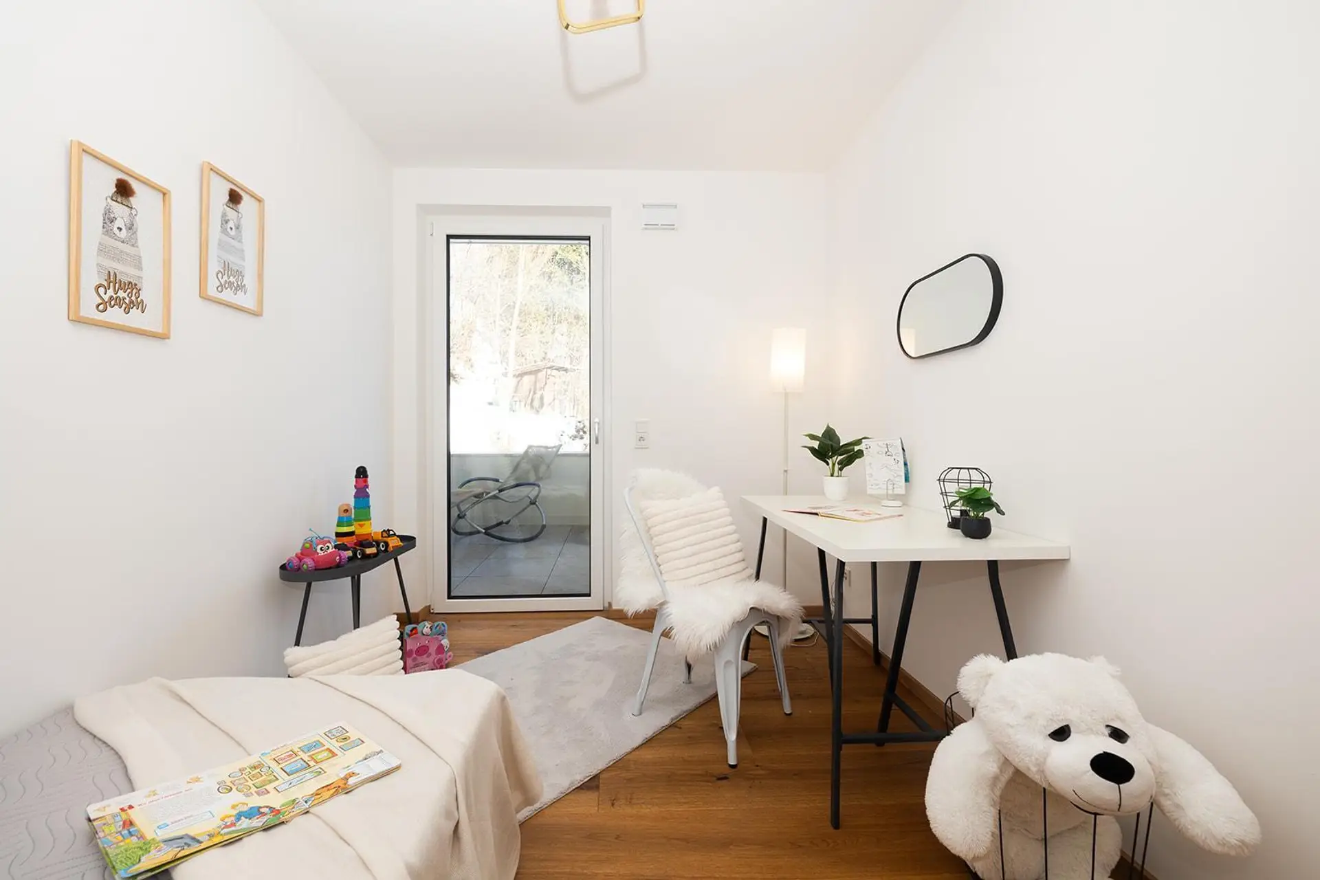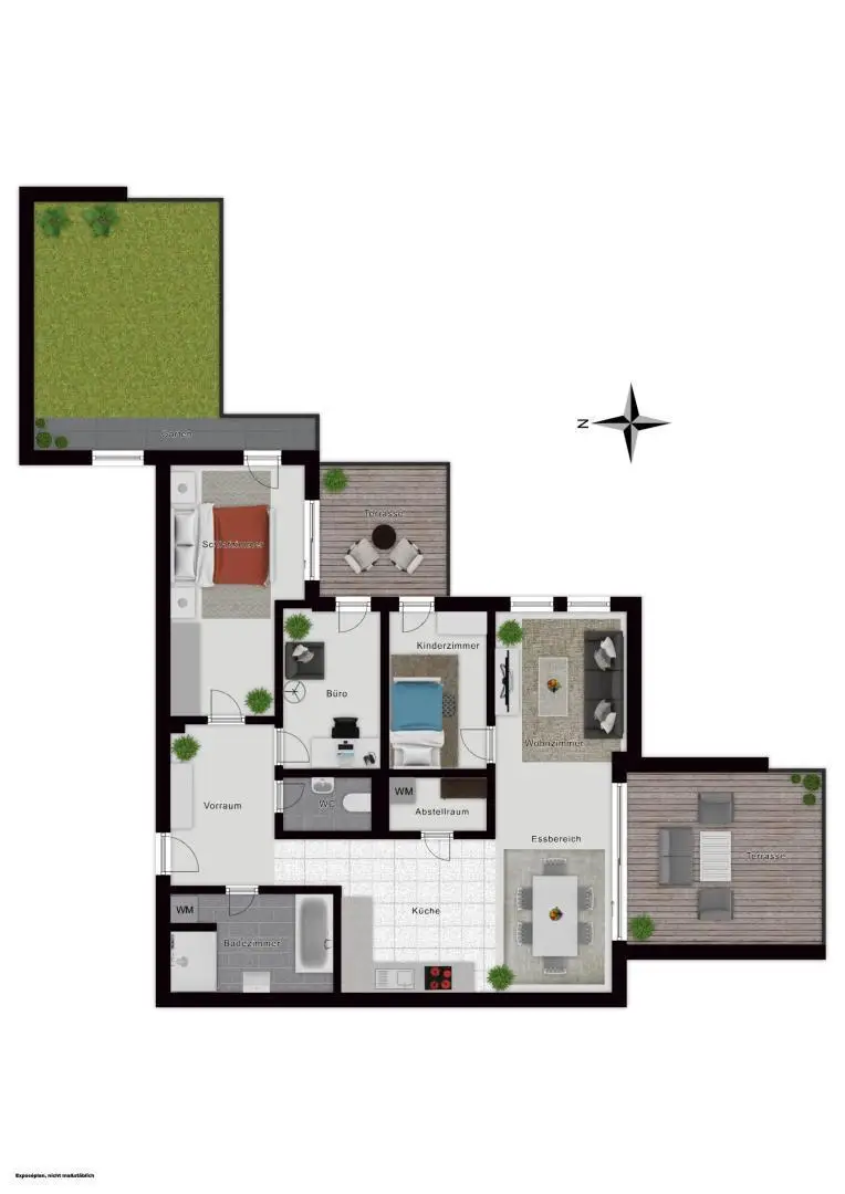 Ein absolutes Alleinstellungsmerkmal dieser Wohnung ist der eigene Garten, der zusätzlich zu den beiden Loggien zur Verfügung steht – ein seltener Luxus, der Raum für Entspannung, Spiel oder gesellige Stunden im Grünen schafft.