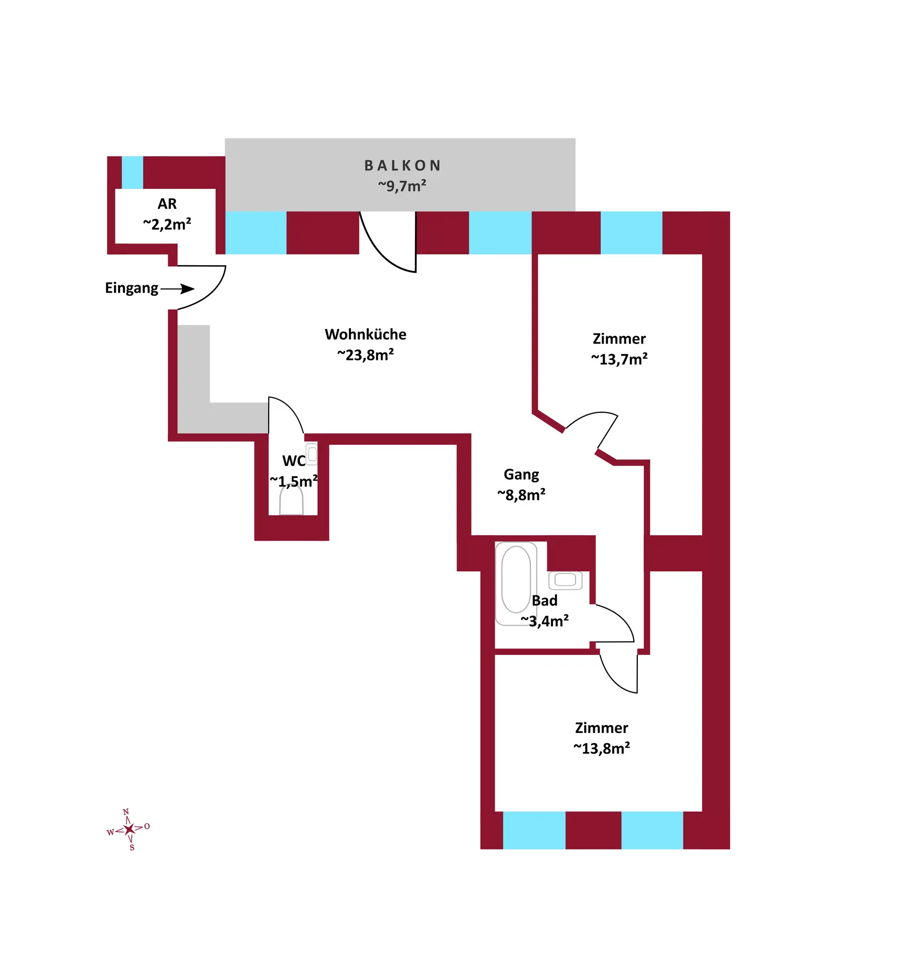 Aufteilung der insgesamt ca. 76,86 m² großen 3-Zimmer Wohnung:
