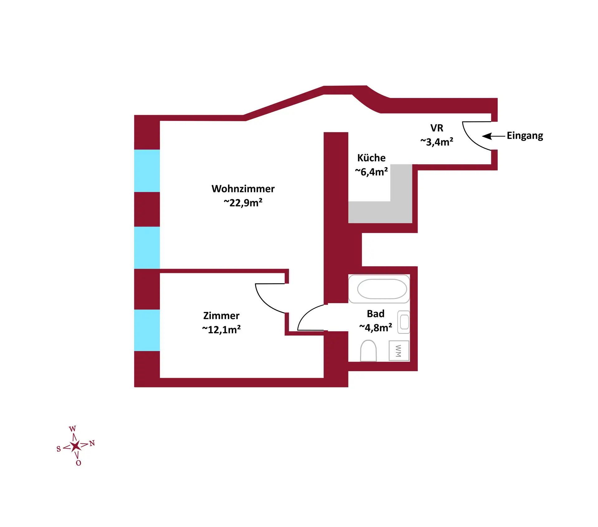 Aufteilung der insgesamt ca. 50 m² großen 2-Zimmer Wohnung: