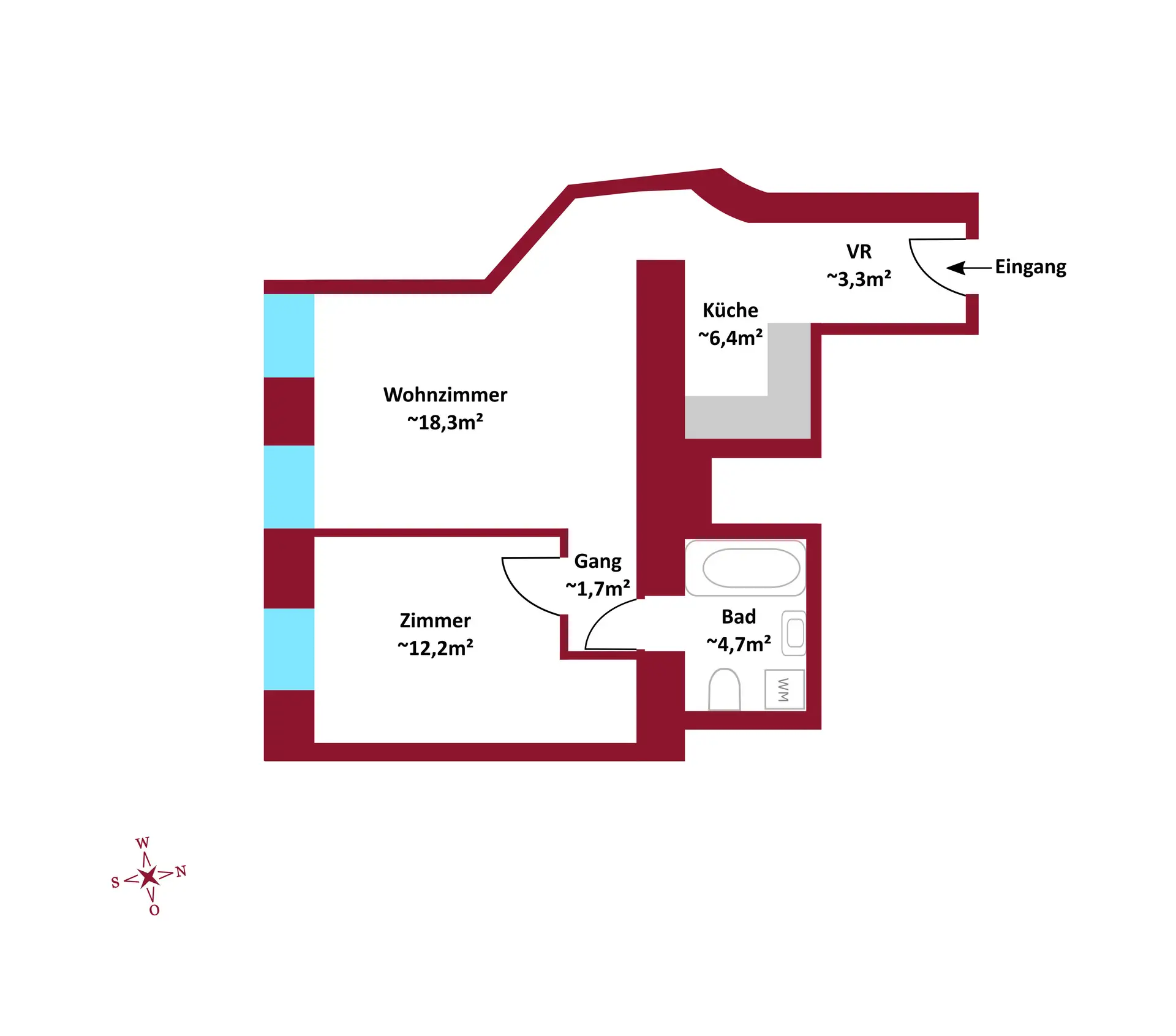 Aufteilung der insgesamt ca. 46,45 m² großen 2 -Zimmer Wohnung: