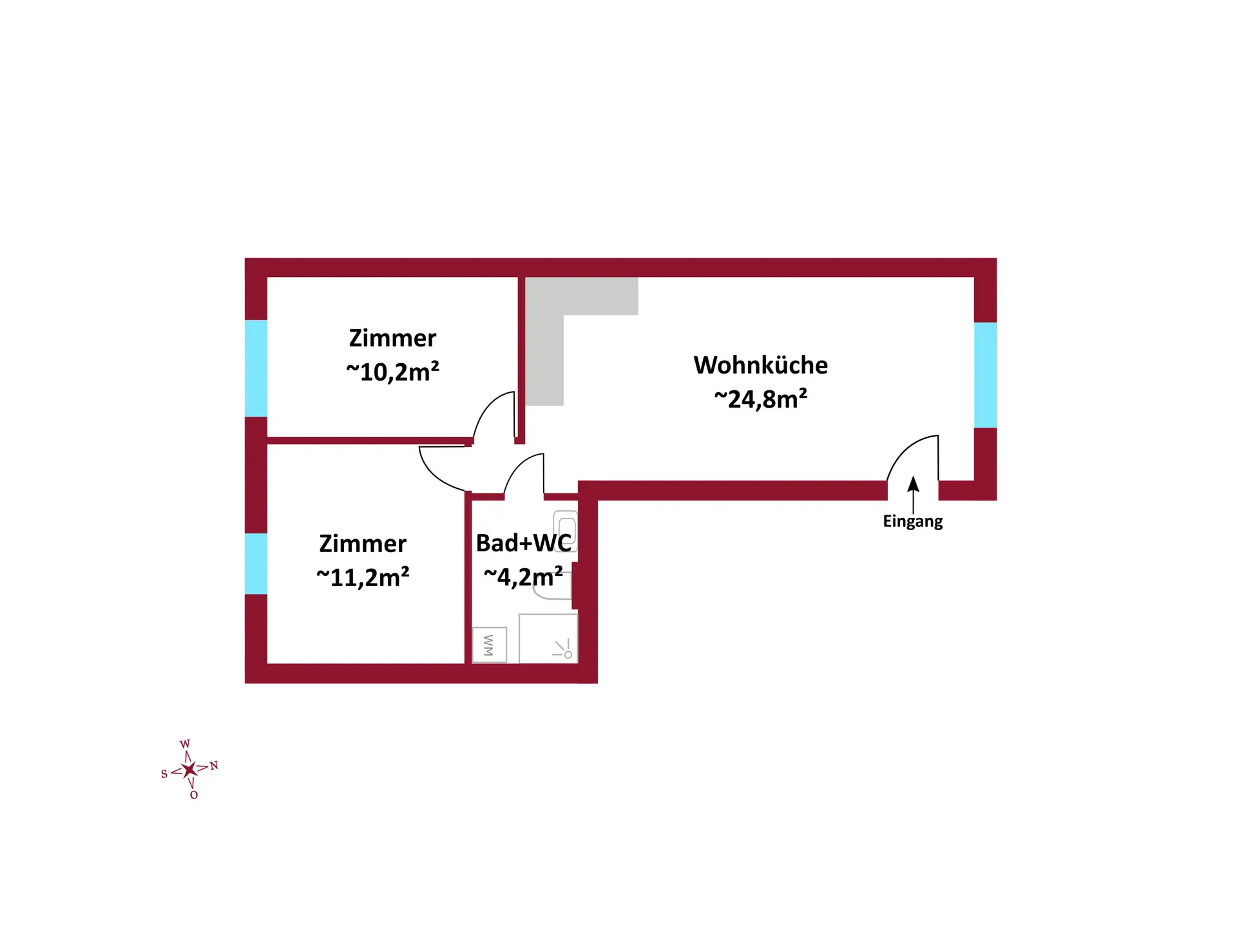 Aufteilung der insgesamt ca. 50,39 m² großen 3-Zimmer Wohnung: