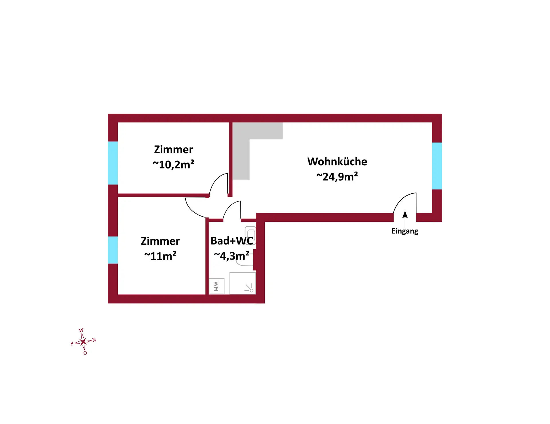 Aufteilung der insgesamt ca. 50,44 m² großen 3-Zimmer Wohnung: