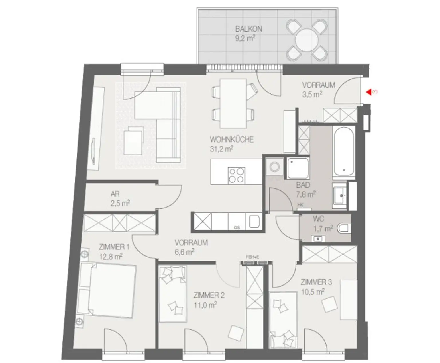 Für höchsten Wohnkomfort zu jeder Jahreszeit sorgen Klimaanlagenvorbereitungen in den Dachgeschoßwohnungen sowie eine flächendeckende Fußbodenheizung in allen Wohnungen. Ein weiteres Highlight bildet die sparsame Luftwärmepumpe, welche sowohl zum Heizen als auch zum Kühlen eingesetzt werden kann, sowie die hauseigene Tiefgarage mit 16 PKW-Stellplätzen und der Möglichkeit E-Ladestationen optional installieren zu lassen.