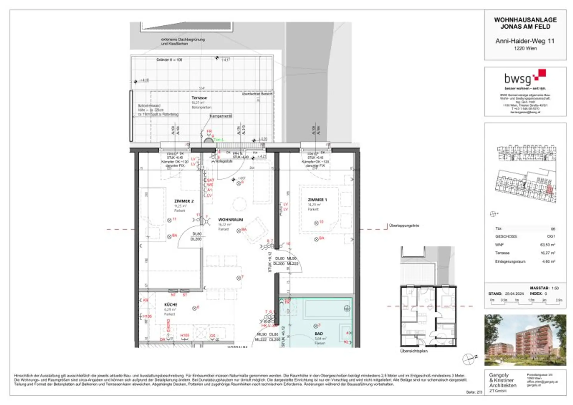 Die Wohnungsgrößen variieren von 39 Quadratmetern bis hin zu geräumigen 106 Quadratmetern, welche sich auf 1 bis 5 Zimmer aufteilen. Alle Wohnungen verfügen über moderne Grundrisse inkl. Freiflächen. Alle Einheiten verfügen über Kellerabteile und auf Wunsch kann ein Tiefgaragenplatz in der hauseigenen Garage erworben werden. Diese verfügen bereits über Vorbereitungen für Wallboxen.