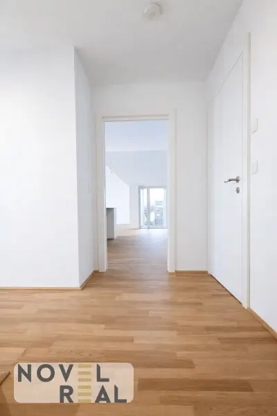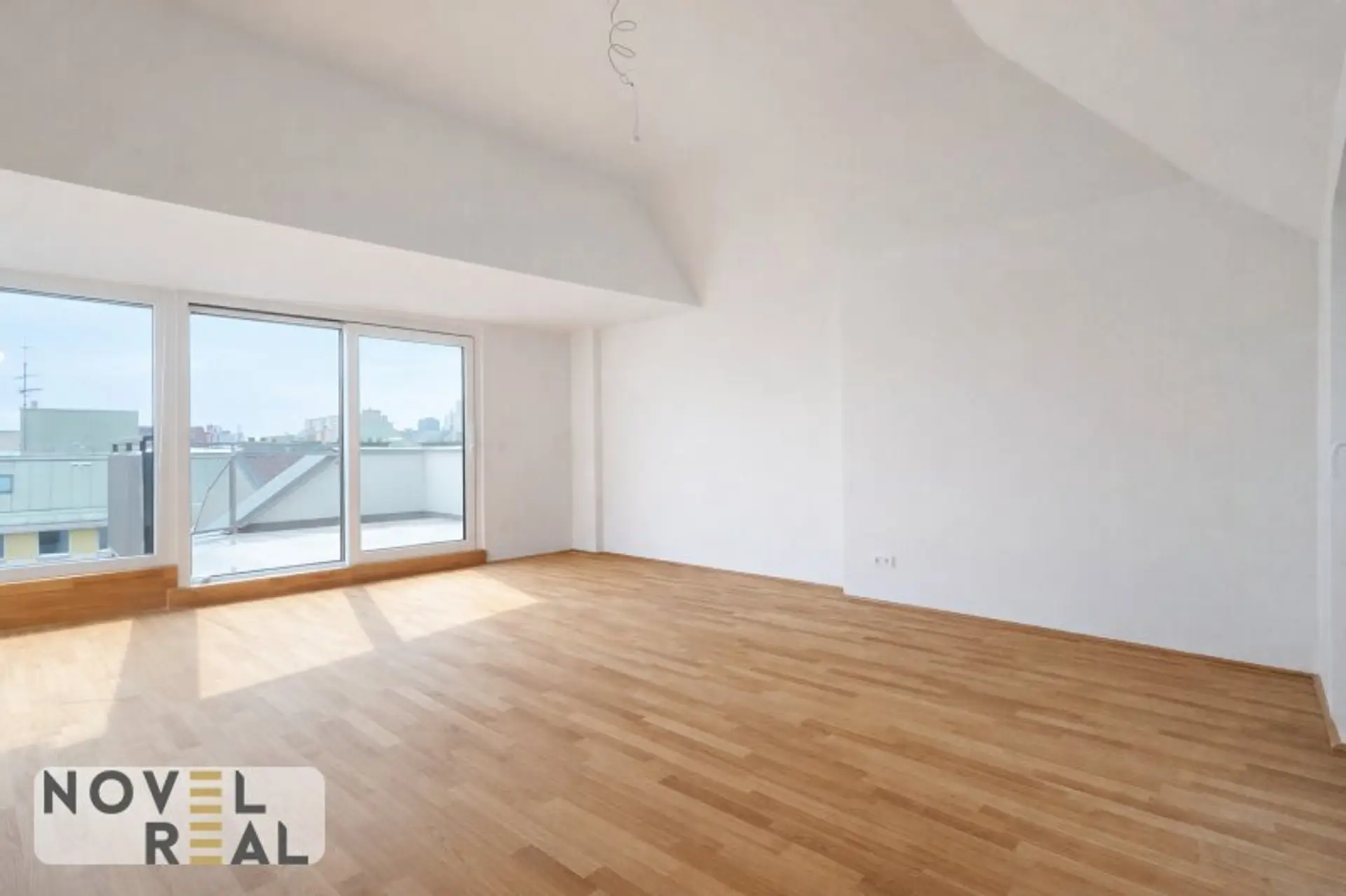 Großzügige Wohnräume mit edlen Holzböden und weitläufigen Fensterfronten schaffen eine helle und einladende Atmosphäre, während die modernen Dachschrägen den Räumen Charakter und Behaglichkeit verleihen.