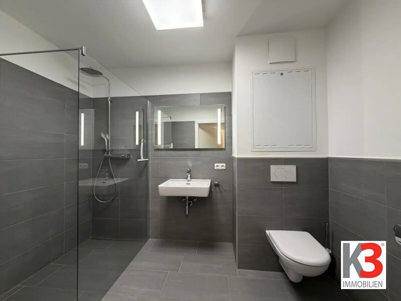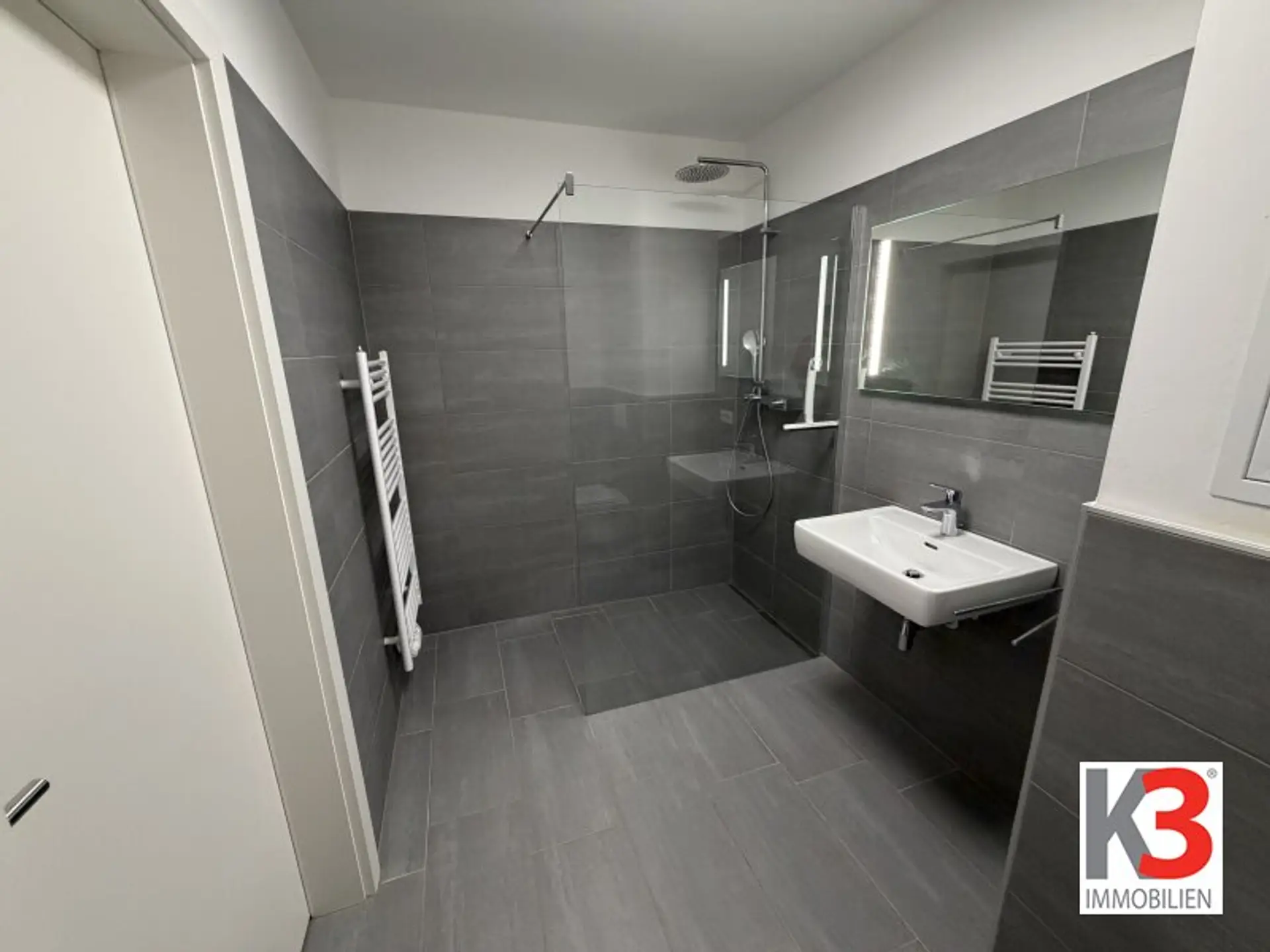 Das sehr moderne Badezimmer punktet mit einem tollen Duschbereich und die sehr geschmackvollen Fliesen tragen zum Wohlfühlen bei.