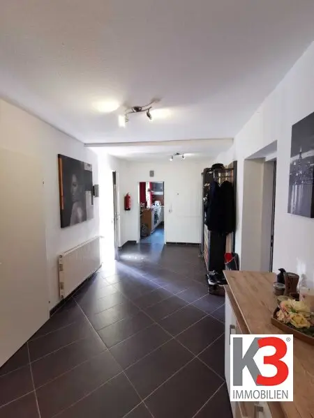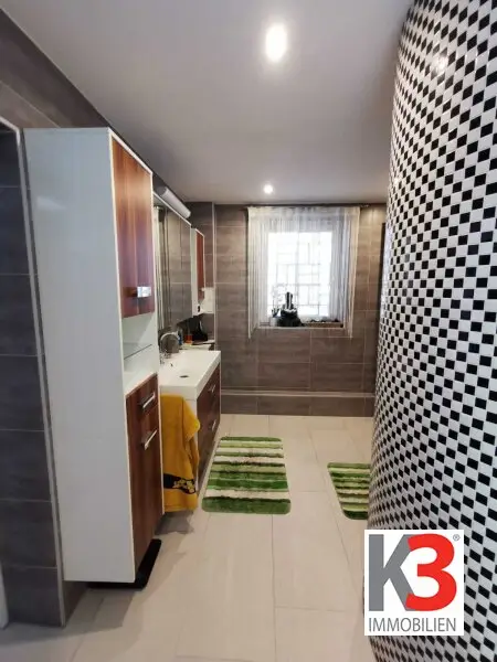 Rechts vom Wohnzimmer befindet sich ein Kinderzimmer und vis a vis das großzügige Badezimmer und die getrennte Toilette