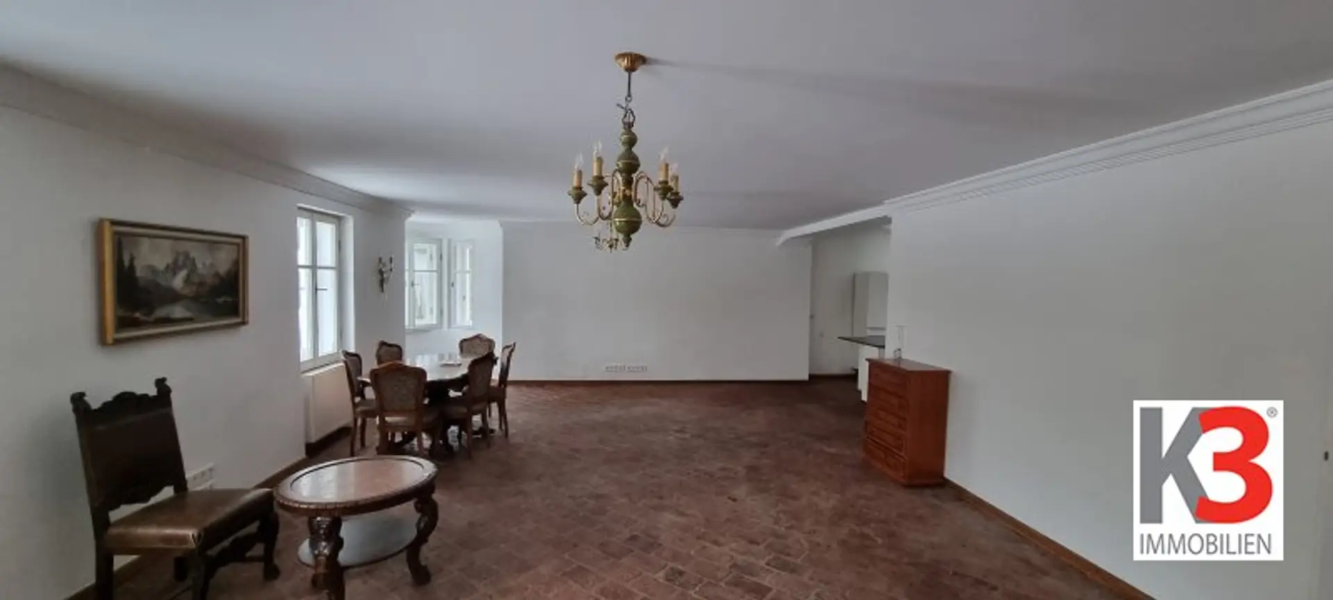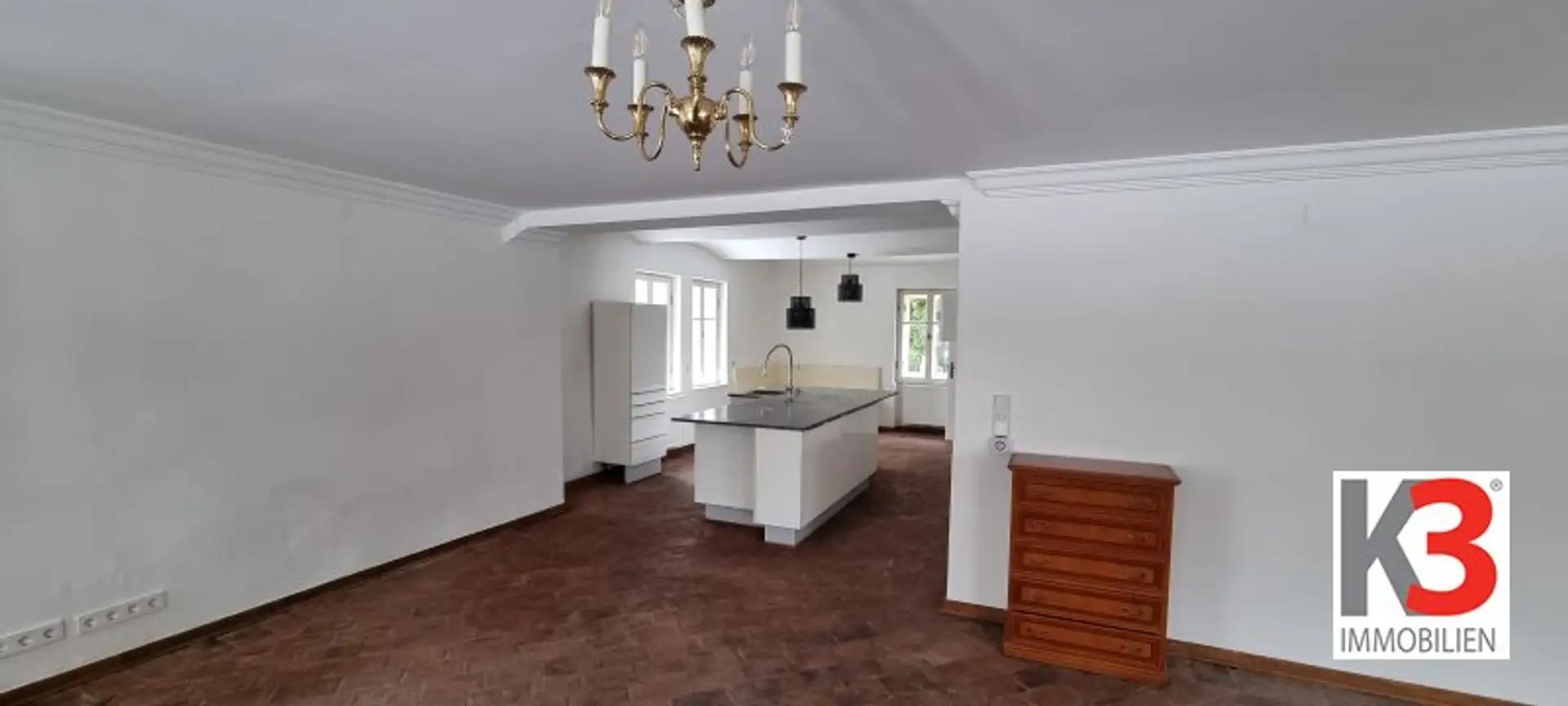 Über eine offen gestaltete Eingangshalle gelangen Sie direkt in offenen Wohnbereich mit Küche. In diesem Bereich finden Sie historische Flügeltüren, sowie aufwendig rekonstruierte Stuckarbeiten und sie kommen direkt auf die ca. 50m² große Terrasse, mit Panoramablick in den malerischen Garten.