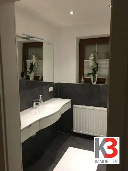 Erdgeschoss: Wohnzimmer mit Kachelofen, separate Küche mit Essbereich, Gästerzimmer, Badezimmer mit Badewanne und Fenster, Speis, separates WC, Garderobe.