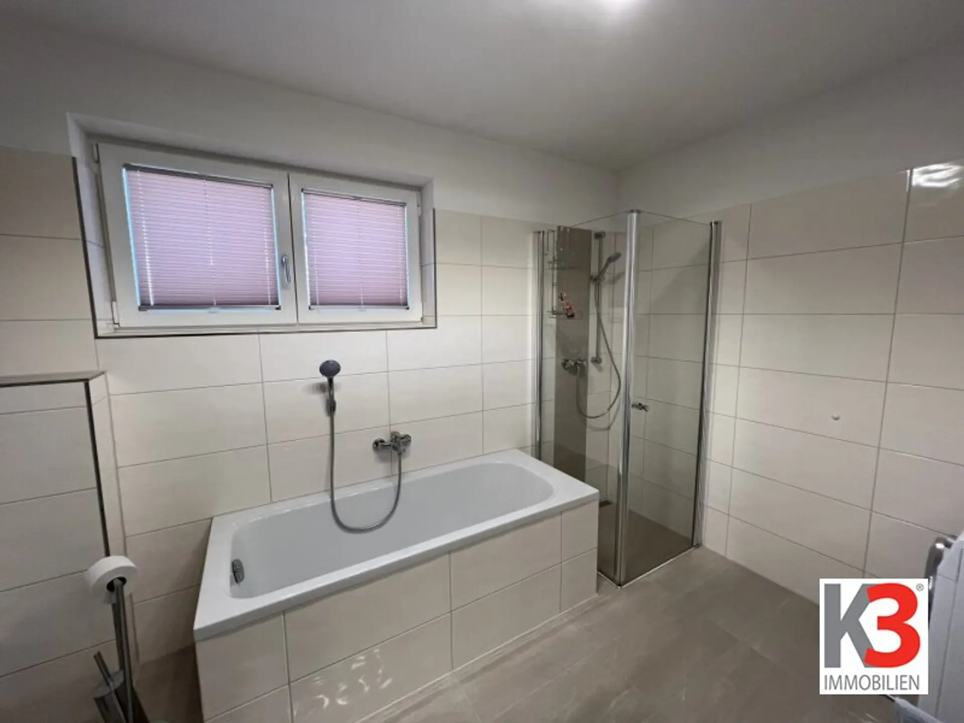 Das Badezimmer mit Tageslicht, Badewanne und Dusche besticht vor allem durch das sehr geschmackvolle Ambiente und seine Größe.