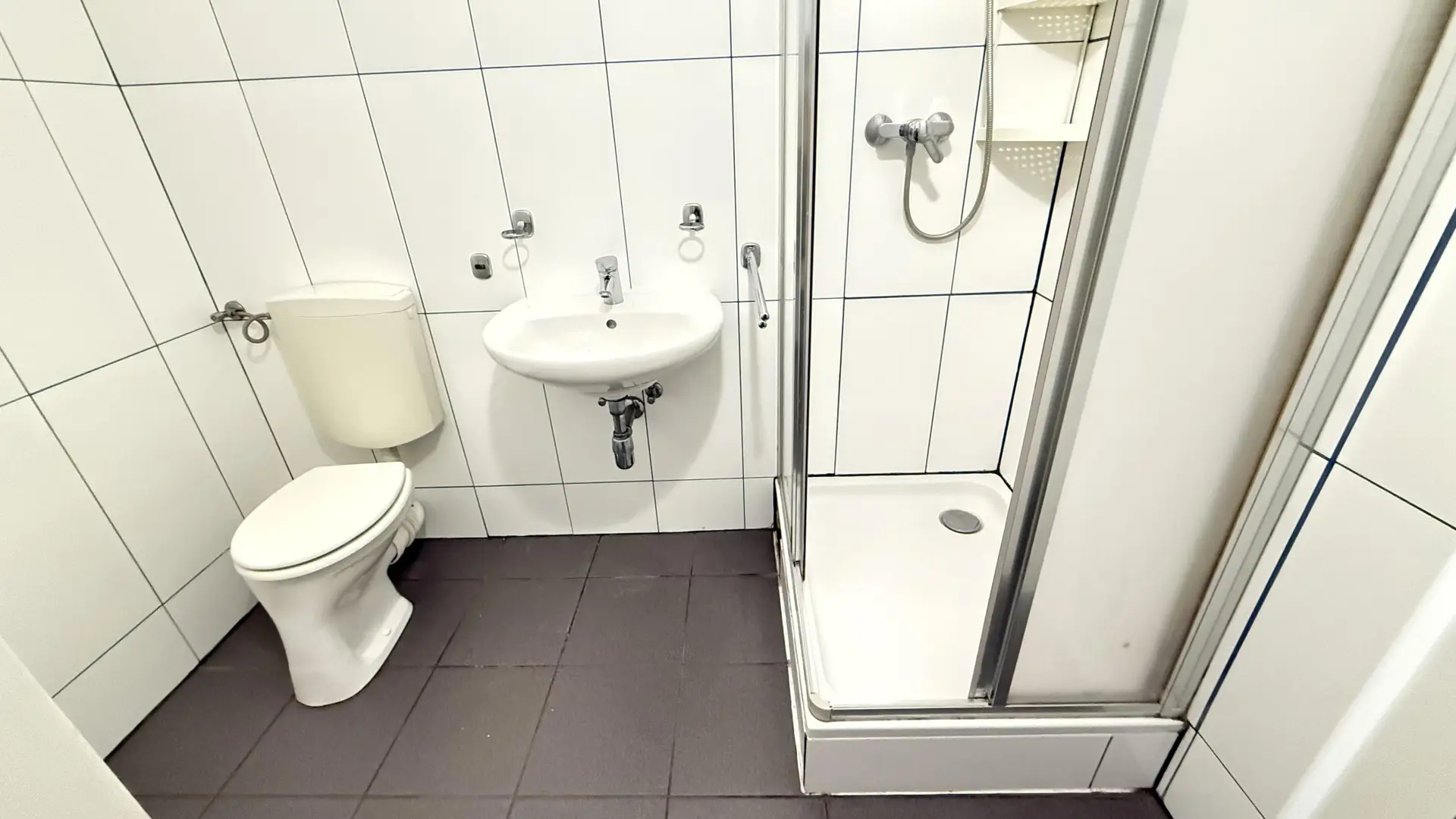 • Bad mit Dusche, WC, Waschbecken (3,38m²)