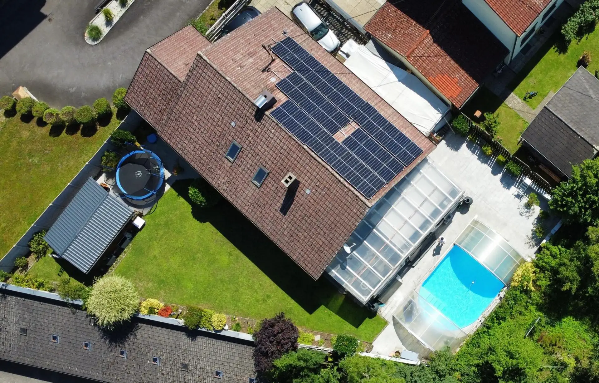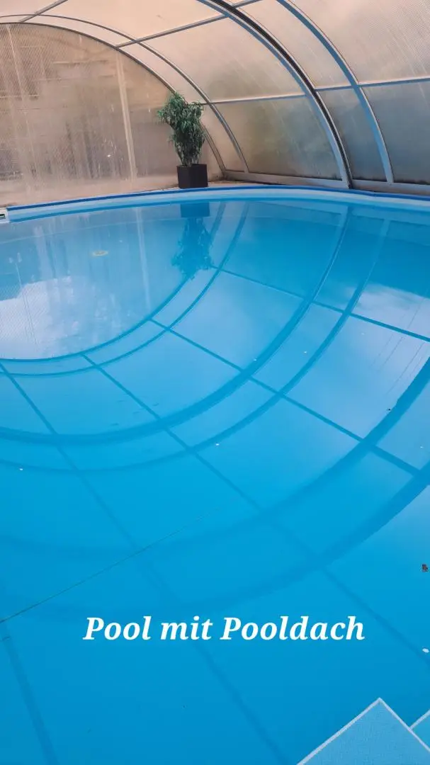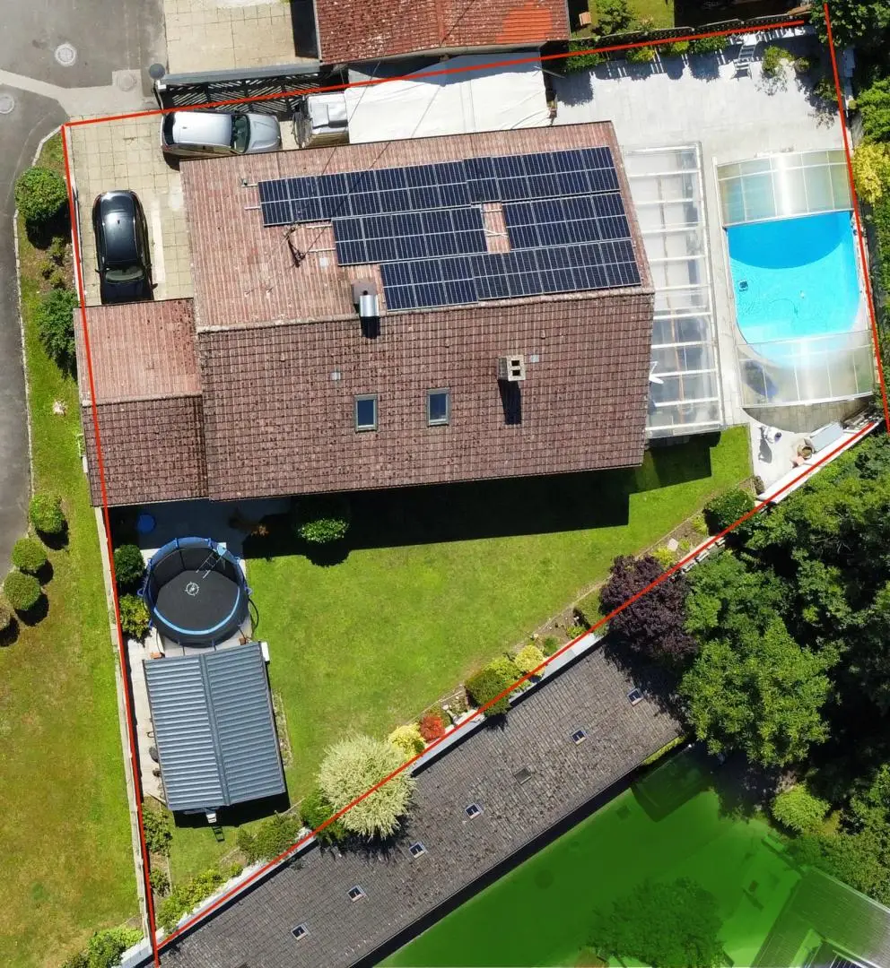 Die großzügige Terrasse lädt zum Entspannen und Genießen ein, während der überdachte Pool für Badespaß bei jedem Wetter sorgt.