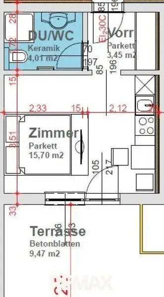 Vorraum, Bad/WC/Du, Wohn/Schlaf-Koch und Essbereich