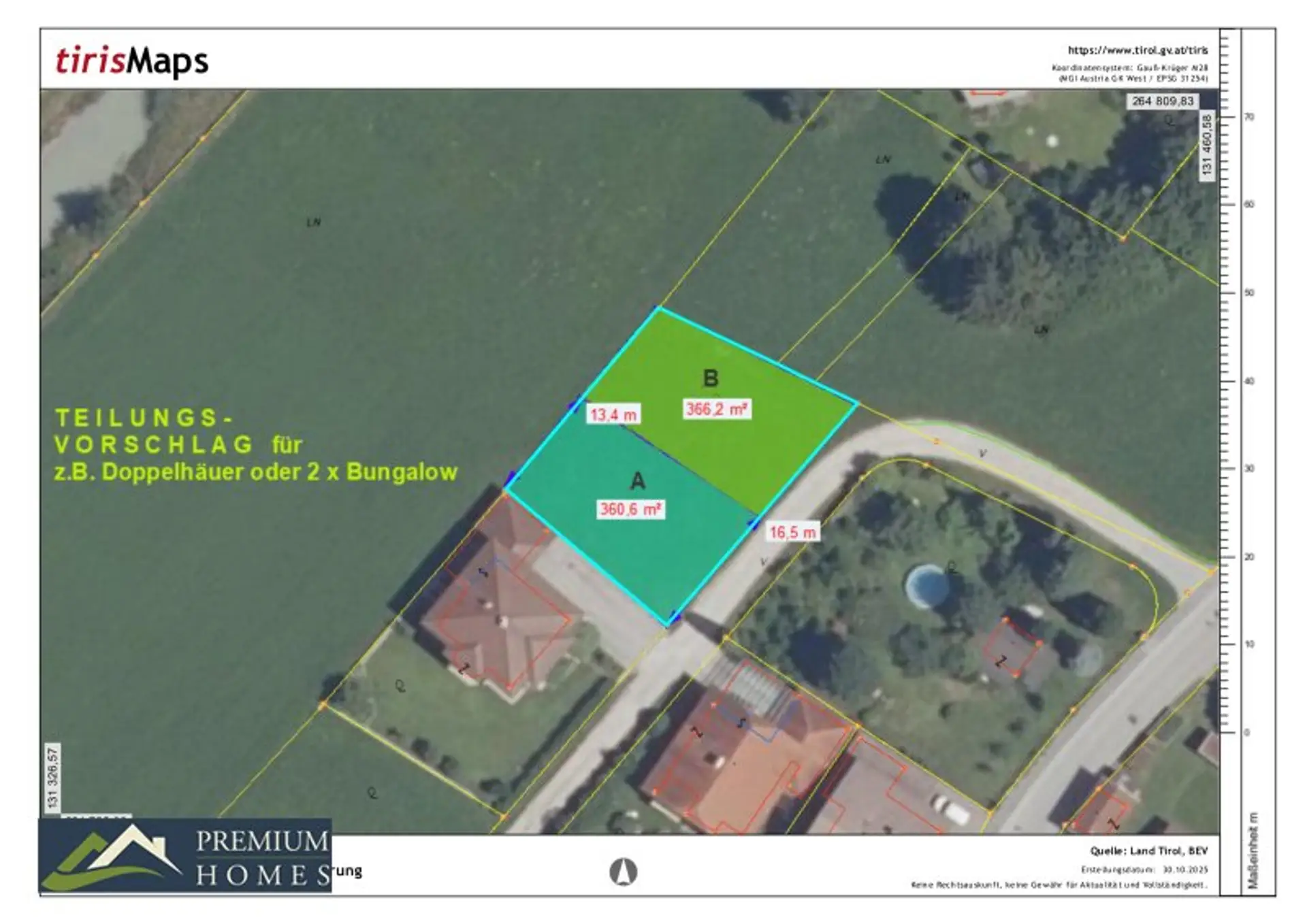 EINE TEILUNG LT. BEISPIEL IM ANHANG IN ZWEI PARZELLEN ZU 360 M² (A) & 366 M² (B) FÜR DOPPELHAUS ODER ZWEI BUNGALOWS IST MÖGLICH.