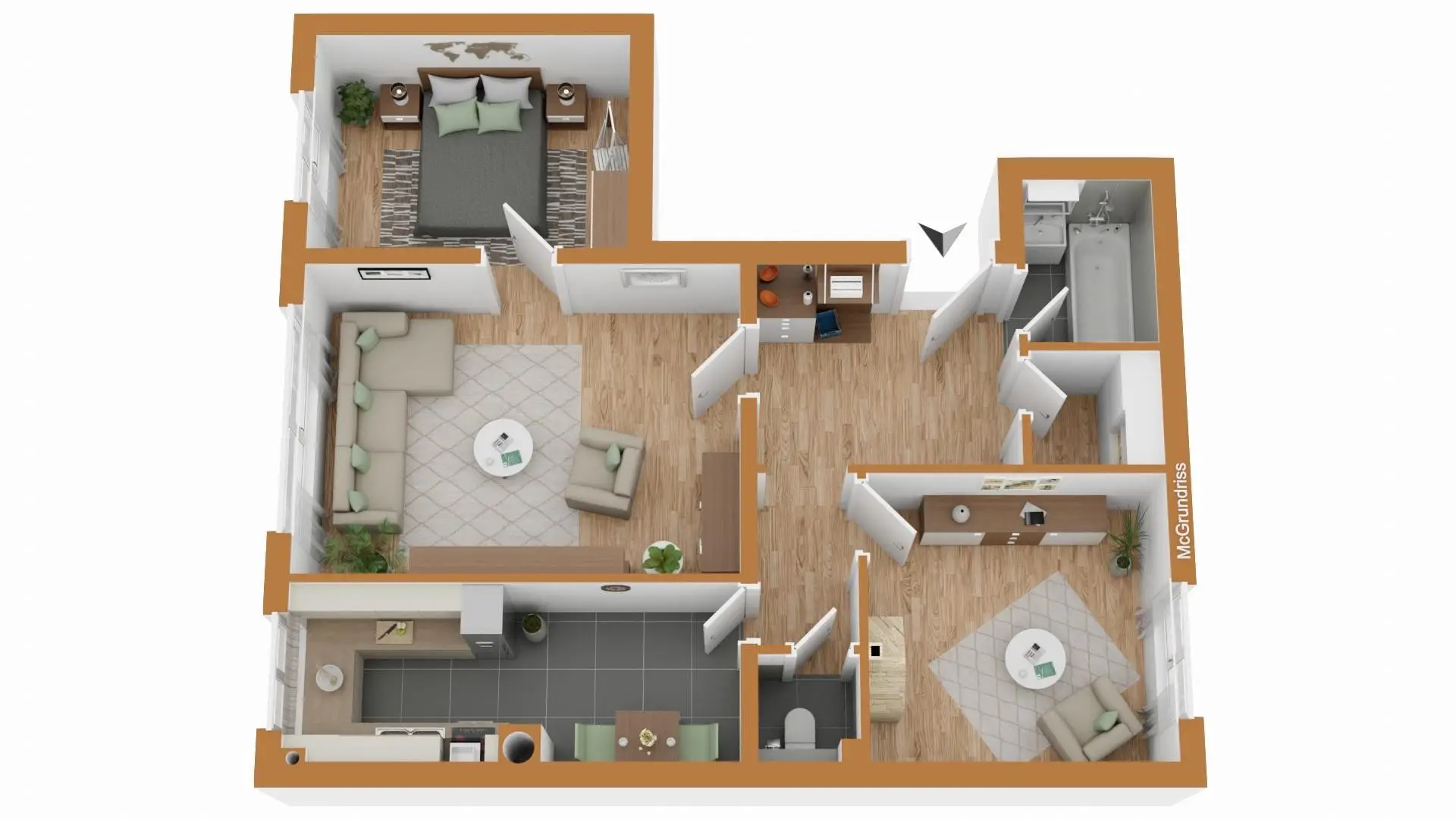 Vorzimmer, Wohnzimmer, Küche, zwei Schlafzimmer, Badezimmer, separates WC sowie einen Abstellraum. Ein großes Kellerabteil ist ebenfalls inkludiert.