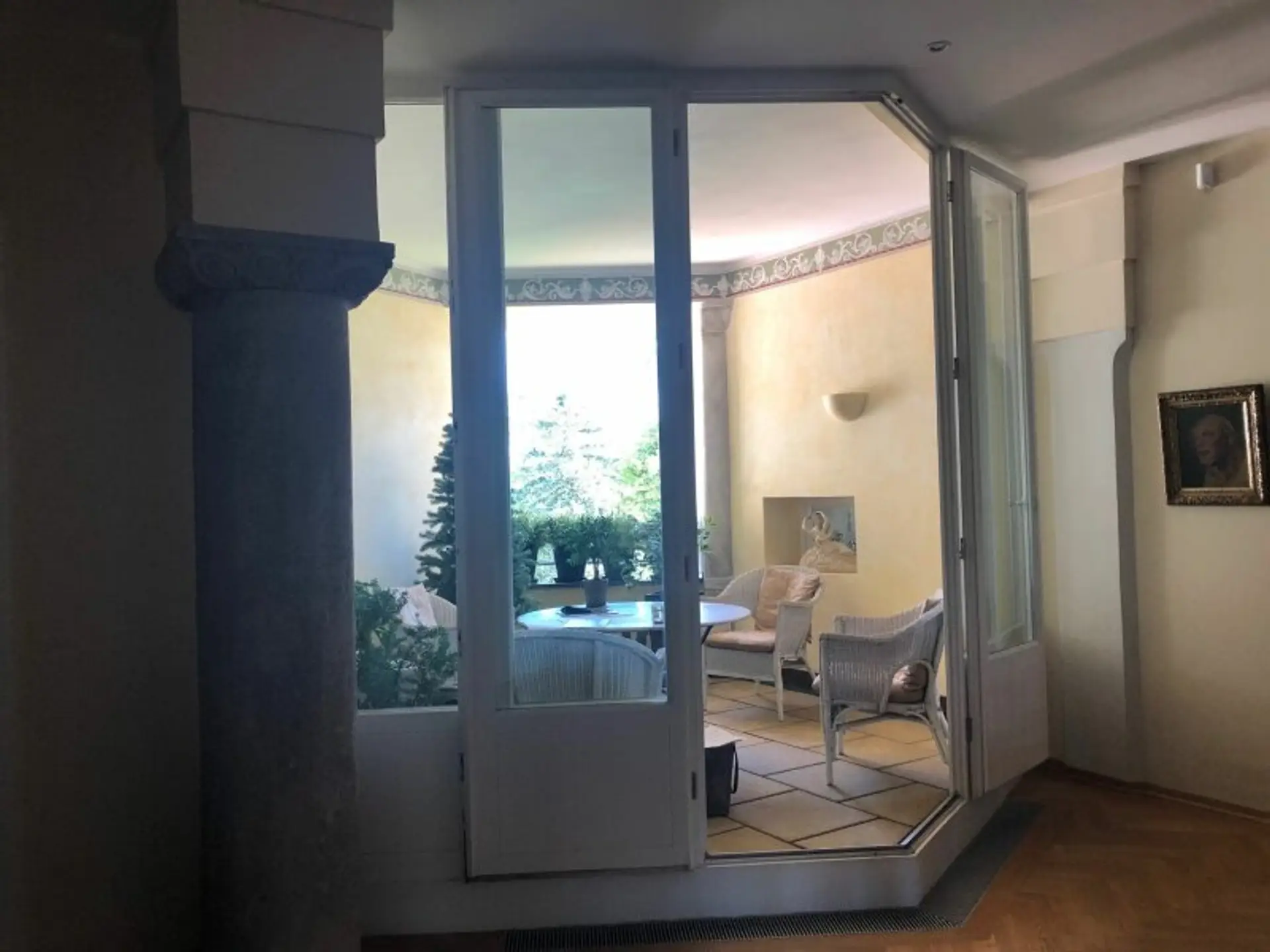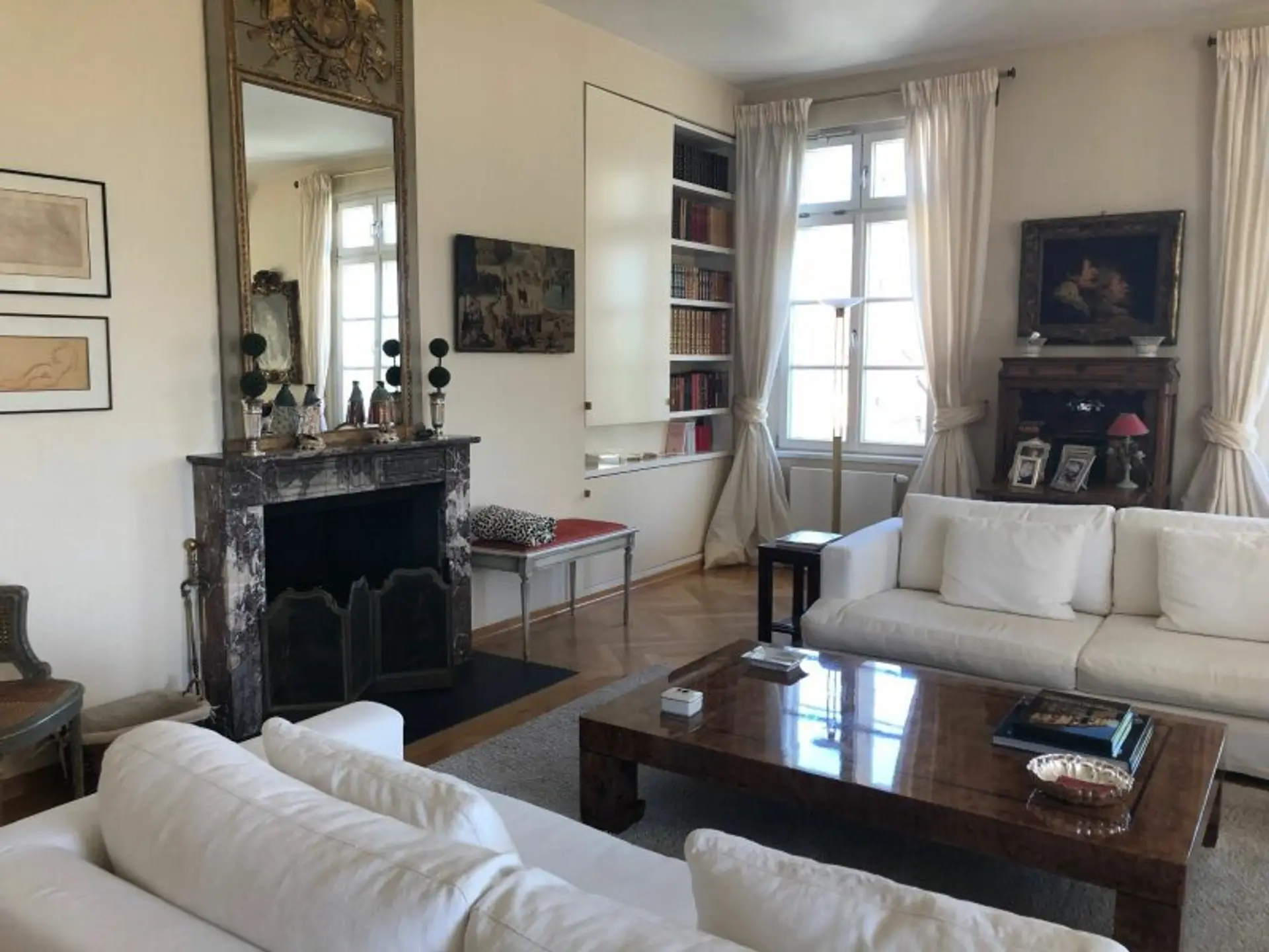 Die Wohnung befindet sich im 2.Liftstock und hat ein großes zentrales Entree, von welchem man direkt in den ca 60m2 großen Salon mit offenem Kamin weitergeht. Es eröffnet sich auch der Blick auf eine sehr charmante Loggia, wo sicherlich auch 10 Personen herrlich speisen können. Im Anschluß daran, beindet sich die Küche mit Miele Geräten und eine kleine Speis-