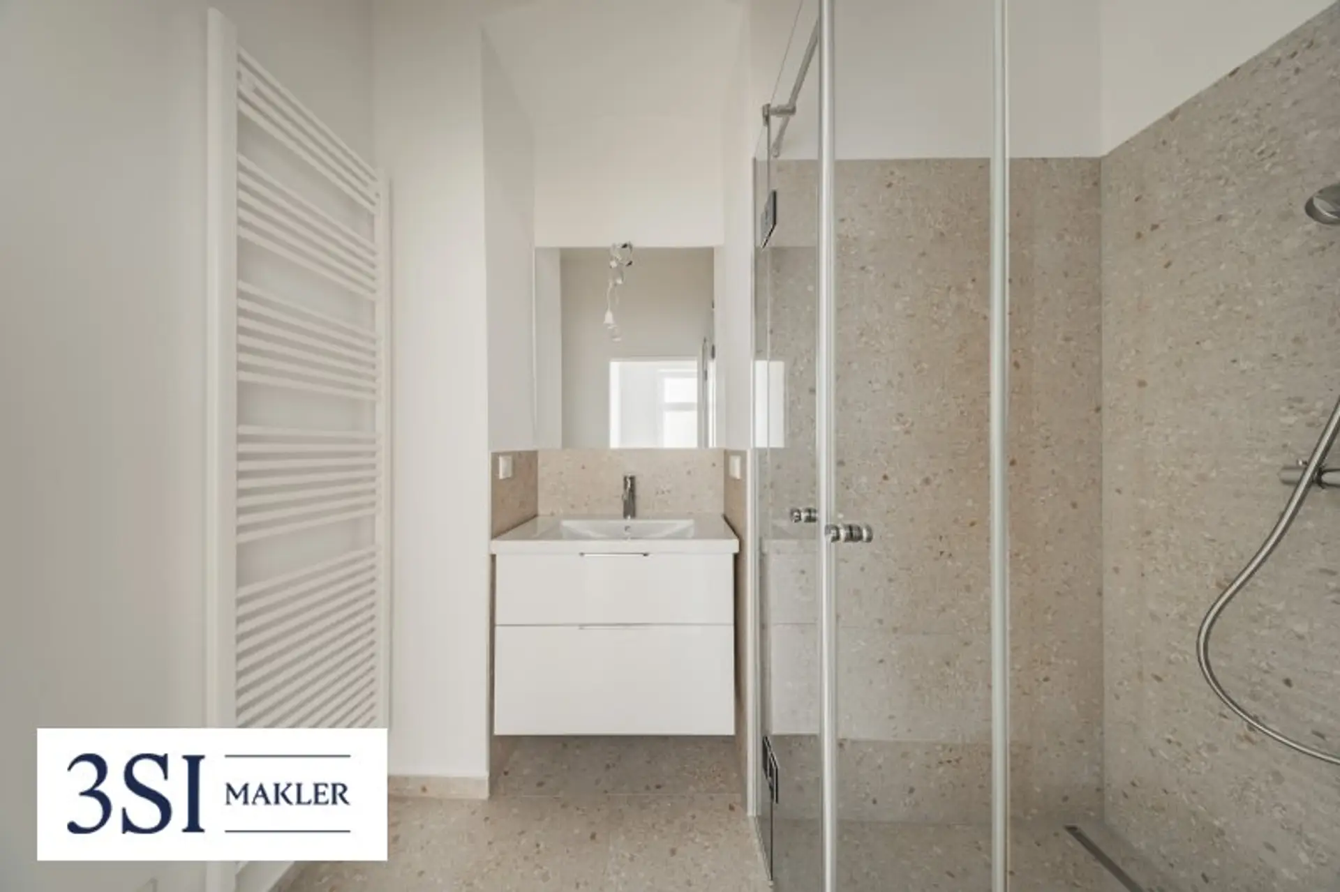 * Badezimmer mit Dusche, Waschbecken und Handtuchheizkörper
