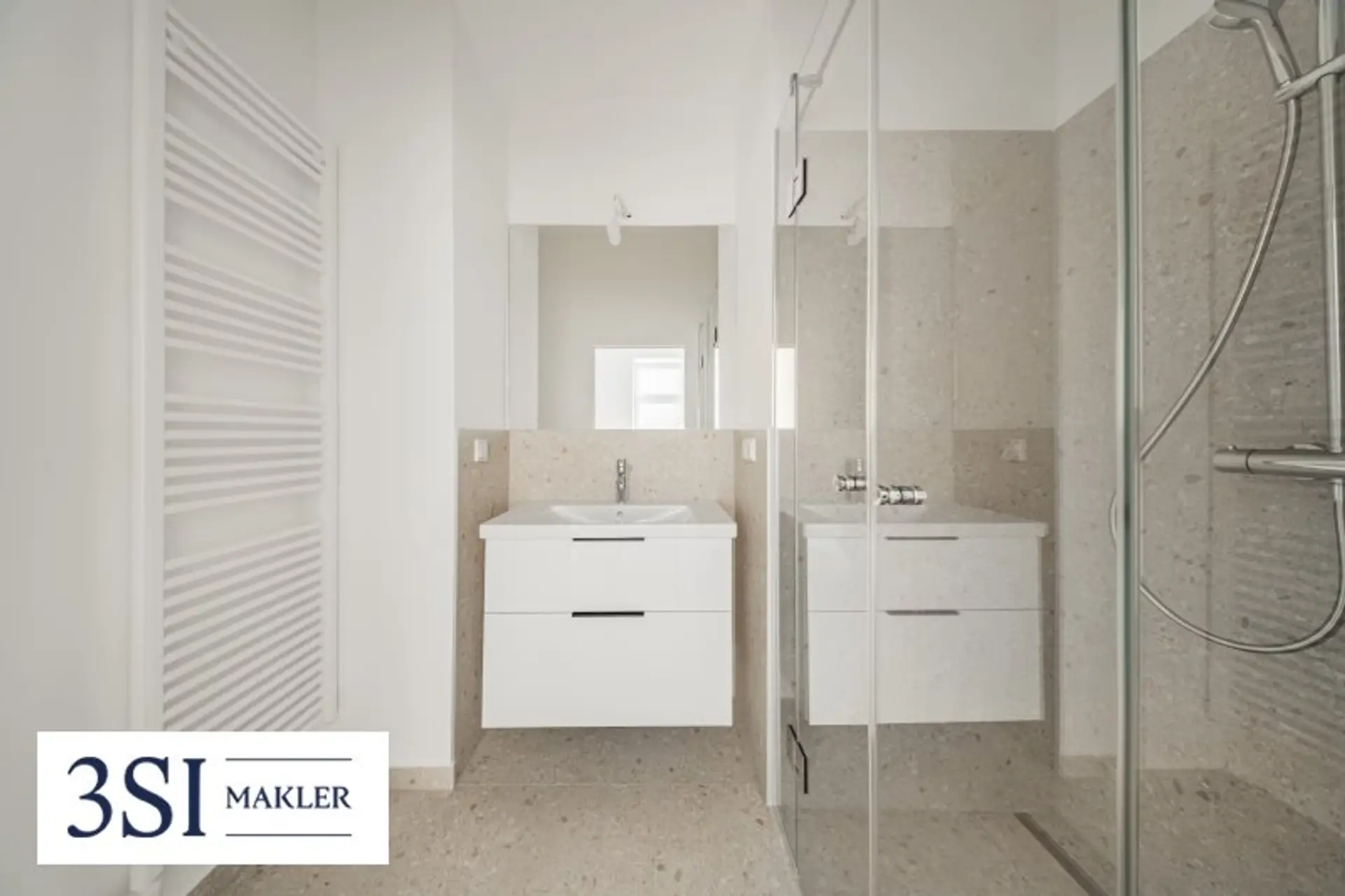* Badezimmer mit Dusche, Waschbecken und Handtuchheizkörper