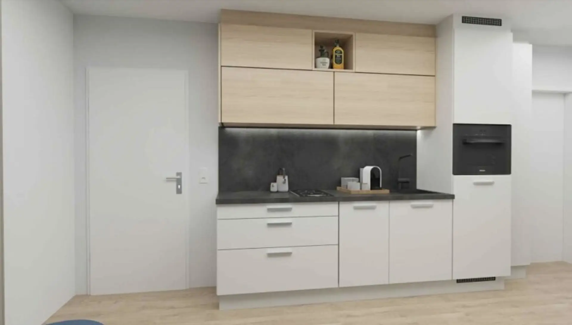 Nach dem Betreten der 31,51 m² großen 2-Zimmer-Wohnung befindet man sich im offen gestalteten Vorraum, welcher idealen Platz für eine Garderobe, oder einen Schrank bietet. Die angeschlossene Wohnküche mit 16,49 m² bietet viel Licht dank bodentiefen faltbaren Fensterflächen. Hier lassen sich eine Couch und ein gemütlicher Essbereich wunderbar einrichten. Ein zeitloser Küchenblock mit Hängeschränken und sämtlichen Geräten ist selbstverständlich Teil der Ausstattung.