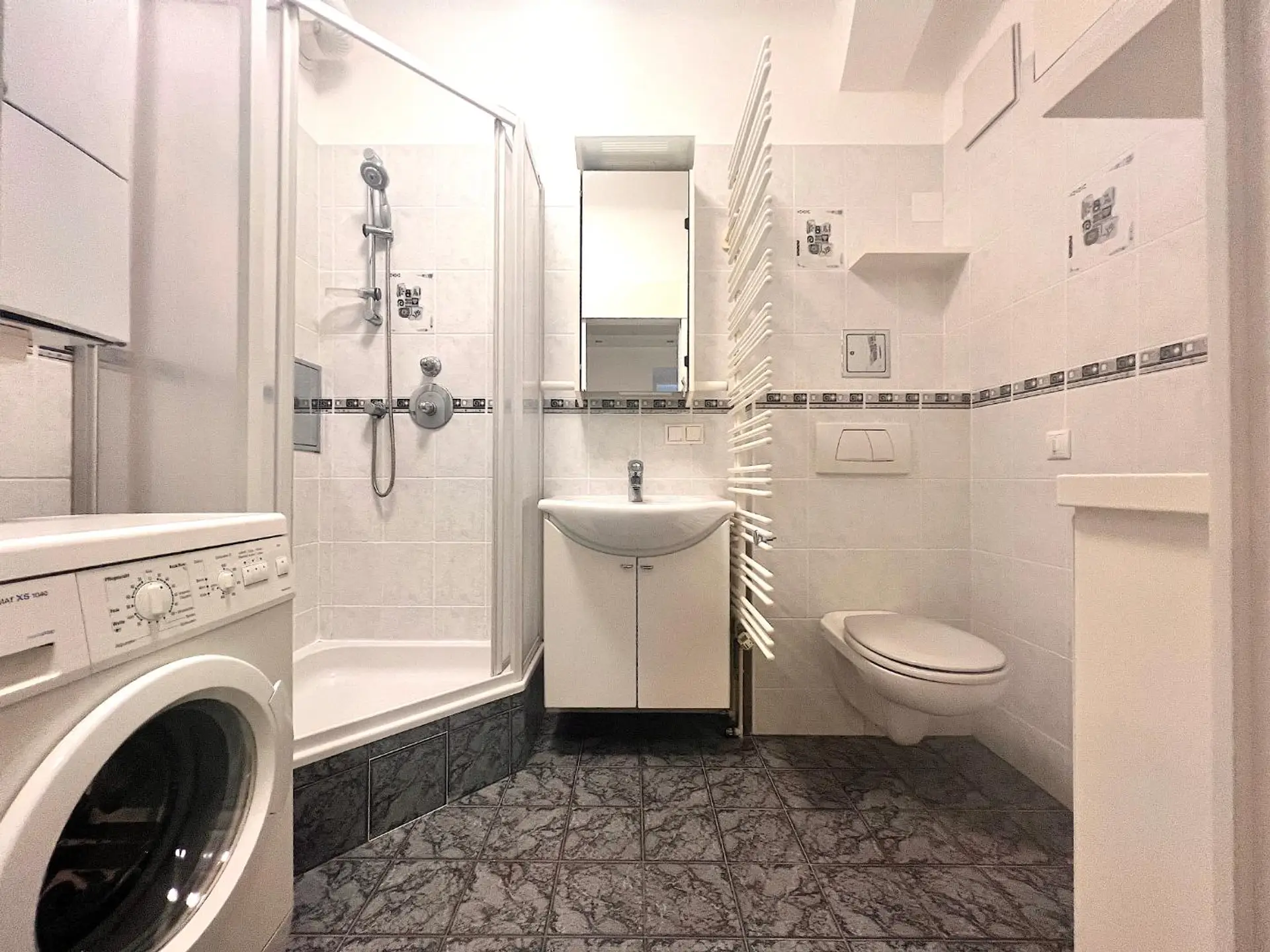 Badezimmer mit Dusche, WC, Handtuchtrockner, Waschmaschinenanschluss
