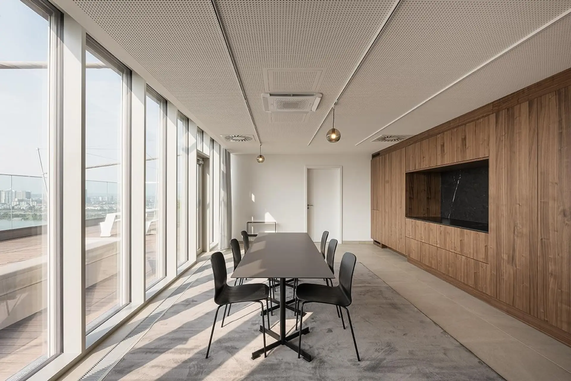 In a brand-new 27-story high-rise, just completed and built to the low-energy standard of the incredible Energy Class A, an ultra-modern two-room apartment on the 6th floor is being offered for first-time occupancy on an initially limited 5-year rental contract. The apartment features breathtaking panoramic views and extensive amenities such as an elegant lobby, concierge service, socializing areas, rooftop outdoor pool with 360° views of Vienna, sauna, fitness facilities, and much more.