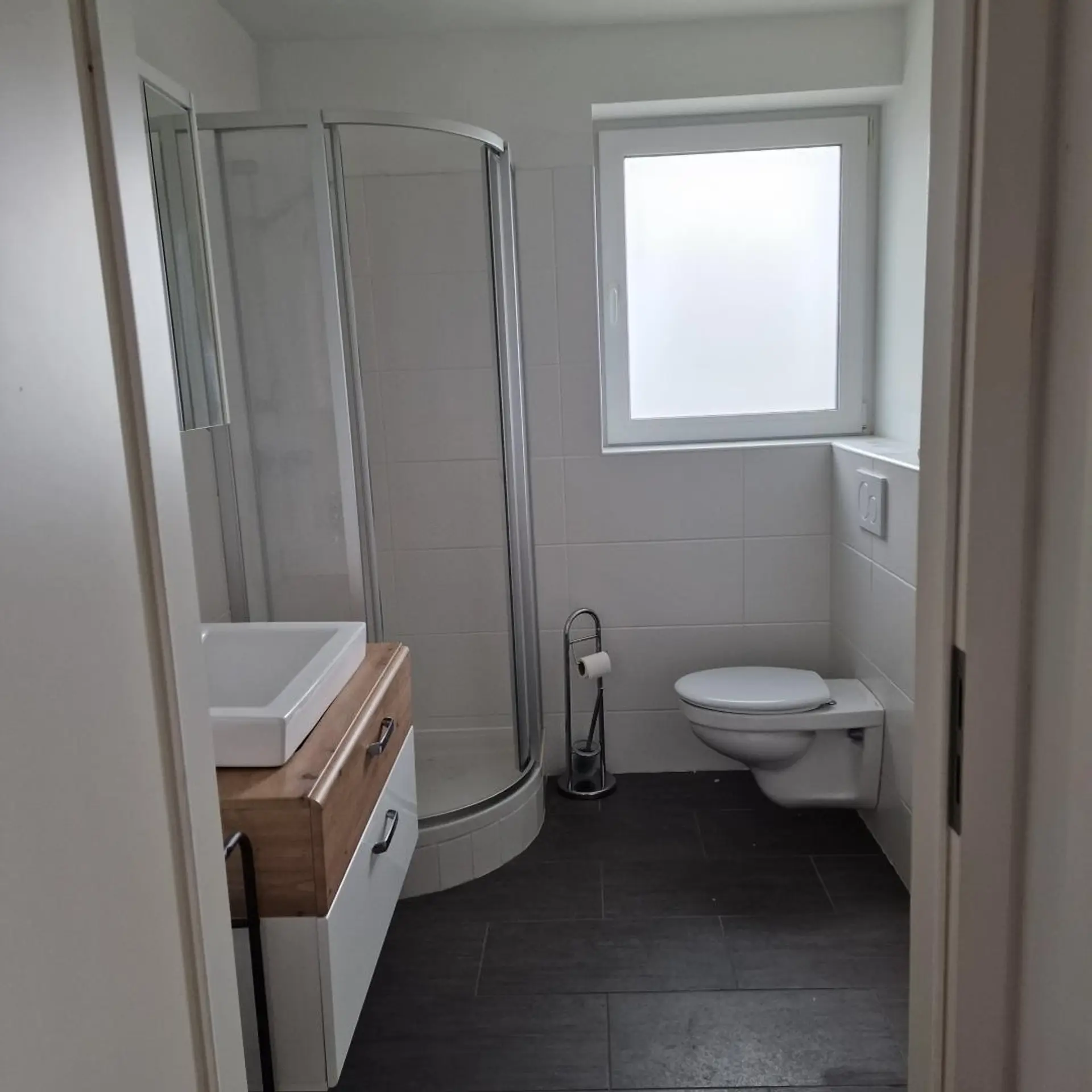 Vorraum, Bad (Dusche, Fenster, Waschmaschinenanschluss) mit WC, Küche möbliert mit kleinem Wohn-/Esszimmer, Schlafzimmer