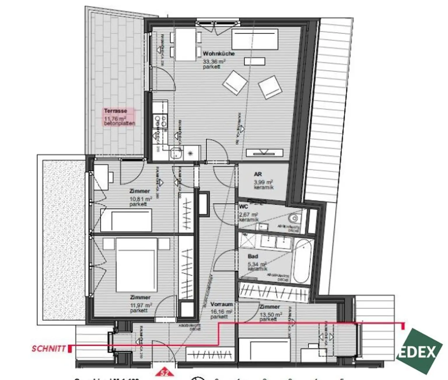 Das Herzstück der Wohnung ist die offene Wohnküche mit ca. 33 m², die über eine moderne Einbauküche mit hochwertigen Geräten verfügt. Von hier aus gelangt man direkt auf die Südwest-Terrasse mit ca. 11,8 m², die in den ruhigen Innenhof ausgerichtet ist – perfekt für entspannte Stunden im Freien.