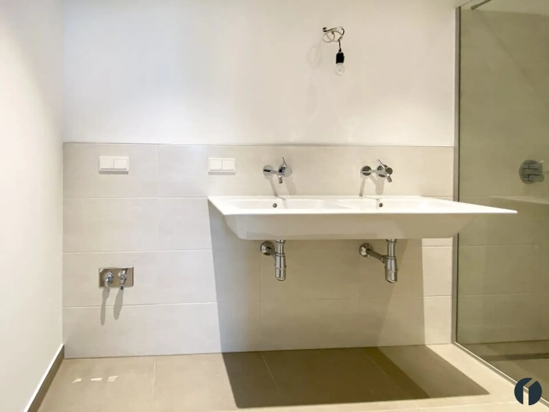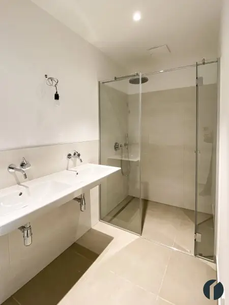 Badezimmer mit Walk-in-Dusche, Doppelwaschbecken, Waschmaschinenanschluss und Deckenspots