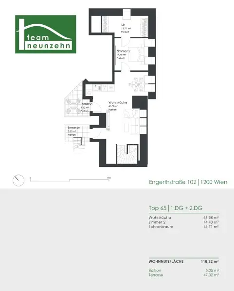 Die 4-Zimmer-Wohnung mit ca. 118,32 m² Wohnfläche, 5,05 m² Balkon und 47,32 m² Terrasse/Dachterrasse befindet sich im 1. und 2. DG.