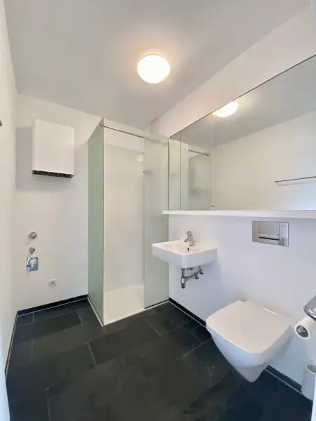 * Badezimmer mit Dusche, WC und Waschmaschinenanschluss