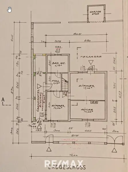Das Haus, das in den 50er Jahren gebaut und dann in den 70er und 80er Jahren erweitert wurde wird aktuell noch bewohnt. Es ist - siehe Plan gut aufgeteilt - im EG befindet sich nebst dem Vorzimmer / überdachten Eingangsbereich, ein Badezimmer mit Dusche, Waschmaschine und WC. Weiters ein Zimmer, das aktuell als Arbeitszimmer genutzt wird, ein Wohnzimmer mit Ausgang in den grünen ruhigen Garten und eine Küche mit einem gemütlichen Essplatz. Über das Vorzimmer gelangt man über eine (steile) Treppe ins OG, das ein großes Wohnzimmer und unter der Mansarde eine weiteren Raum für Hobbies oder Stauraum bietet - das OG verfügt aktuell NICHT über die gesetzliche Mindesthöhe und ist daher (rechtlich gesehen) KEINE Wohnfläche, aber sehr wohl nutzbar und gem. den Plänen genehmigt.
