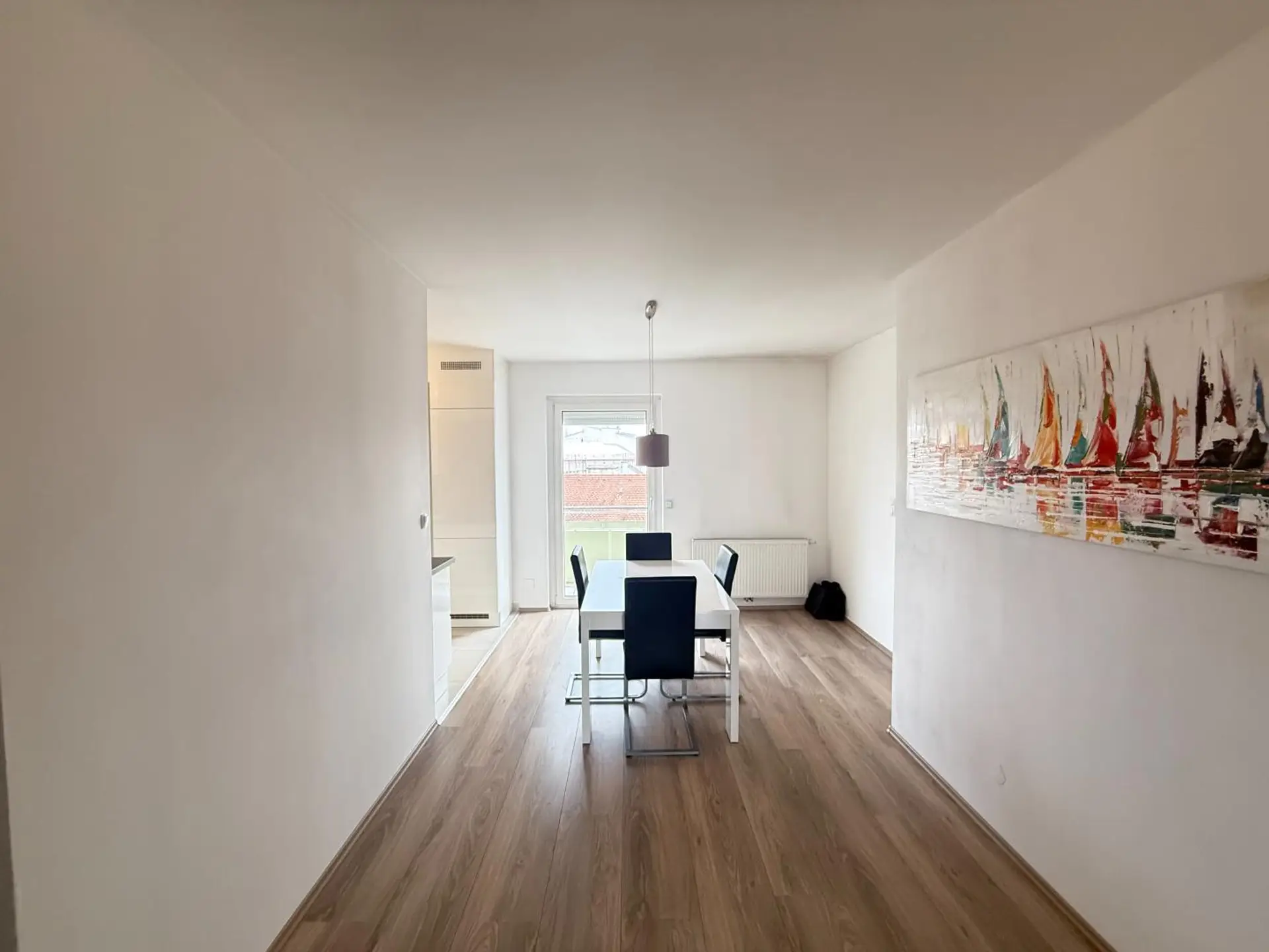 Die Wohnung wurde vor kurzem umfassend und hochwertig renoviert und präsentiert sich in einem zeitgemäßen, stilvollen Ambiente. Große Fensterflächen sorgen für lichtdurchflutete Räume, während praktische Rollos für Privatsphäre und Sonnenschutz sorgen.