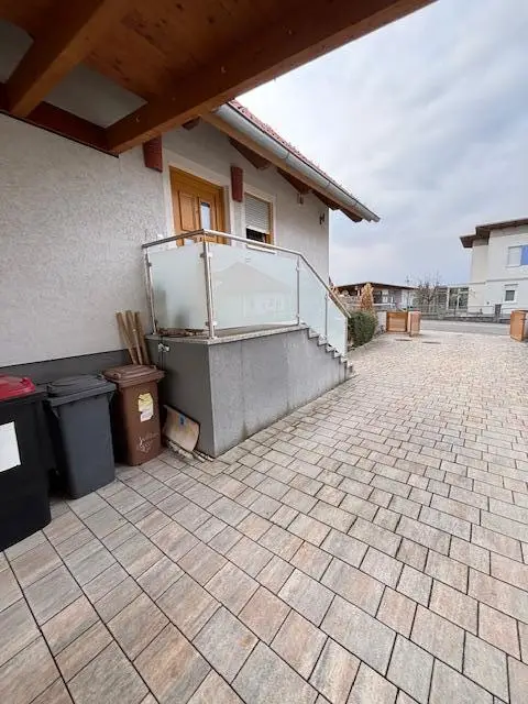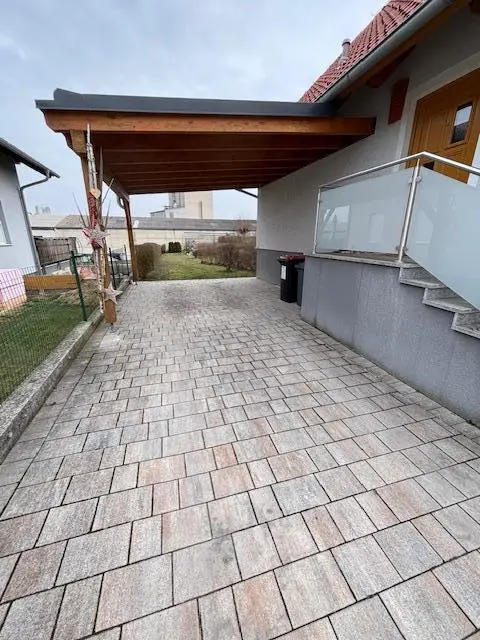 Über die gepflasterte Einfahrt gelangt man zum Eingangsbereich und zum Carport. Die Terrasse und der straßenseitige Alu-Zaun
