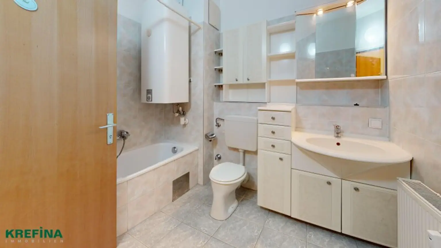 - Badezimmer mit Wanne, Waschbecken, Waschmaschinenanschluss und WC