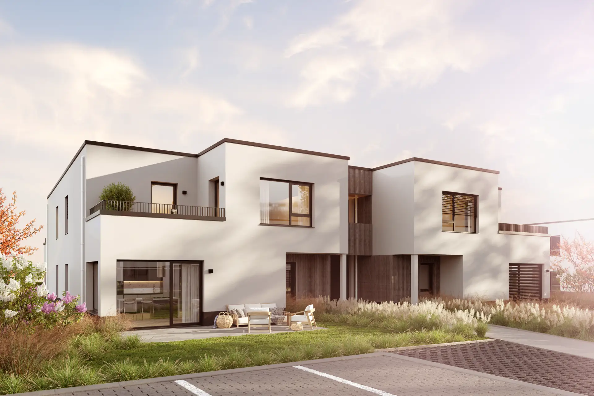 Die 4 Reihenhäuser zeichnen sich durch ihren eigenen Garten, zwei Vollgeschosse und helle Räume aus. Sie verbinden Privatsphäre mit funktionalem Wohnkomfort und sind besonders passend für junge Familien. Der offene Wohnbereich im Erdgeschoss lädt zu gemeinsamen Stunden ein, während die Schlafräume im Obergeschoss Ruhe und Rückzug ermöglichen – perfekt abgestimmt auf das Leben im Alltag.