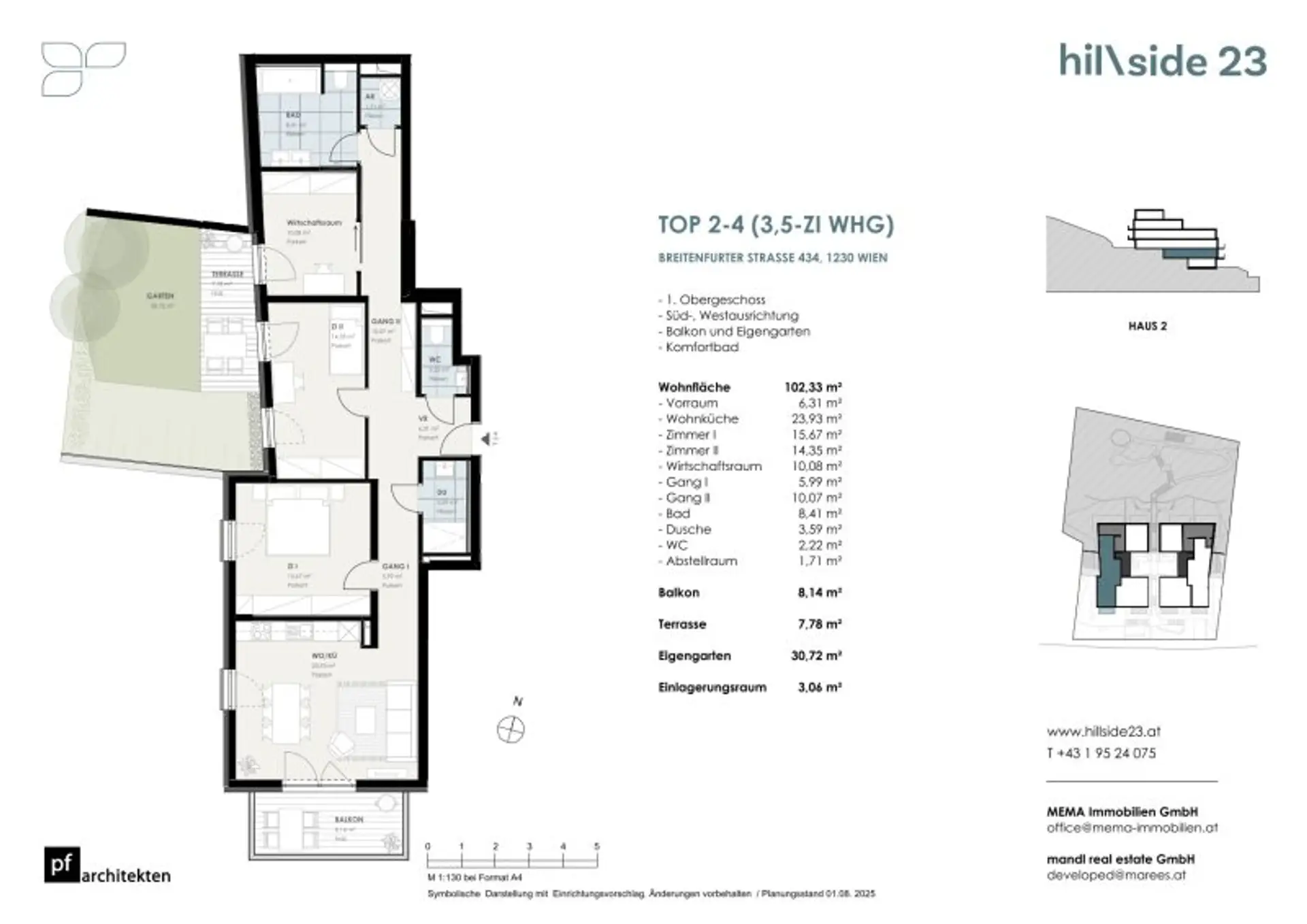Zum Verkauf steht eine ca. 102 m² große 3-Zimmer-Gartenwohnung in einem Ende 2027 fertig werdenden Neubau. Die Wohnung befindet sich im 1. Obergeschoss. Die Wohnung blickt in die Breitenfurter Strasse Richtung Südwesten.