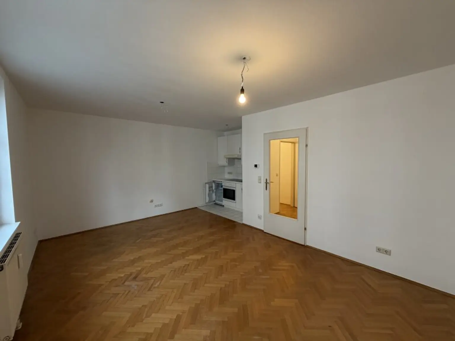 Der Wohnraum ist praktisch geschnitten und bietet ausreichend Platz für Wohnen, Schlafen und Arbeiten. Die offene Küche ist harmonisch in den Wohnbereich integriert und ermöglicht eine effiziente Nutzung der Fläche.