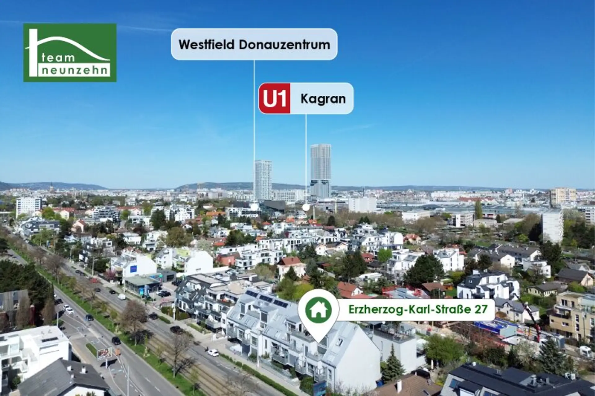 In jeweils etwa 15 Gehminuten oder rasch erreichbar mit Straßenbahn oder Bus befinden sich die beiden U1 Stationen Kagran und Alte Donau. In Kagran befindet sich dazu das größte Shopping-Center Wiens, das Westfield Donauzentrum mitsamt Kino und vielen weiteren Restaurants und Bars.