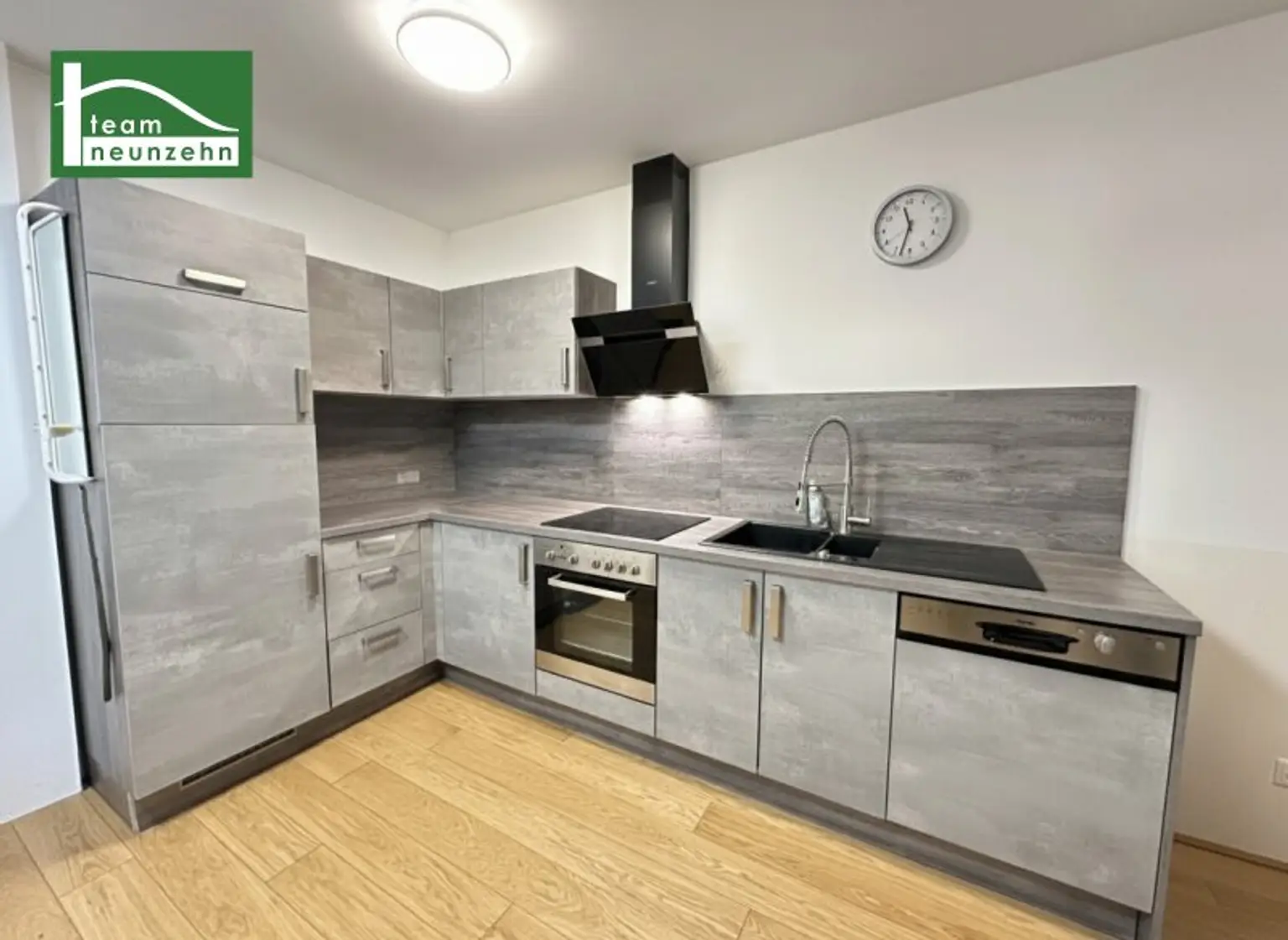 Die inkludierte, hochwertige Einbauküche verfügt bereits über sämtliche Elektrogeräte wie Geschirrspüler, Kühlschrank mit Gefrierfach, Backofen, Kochfeld, Dunstabzug und Mikrowelle. Sie ist in modernem Grau gehalten mit Akzenten in Schwarz und Chrom.