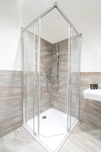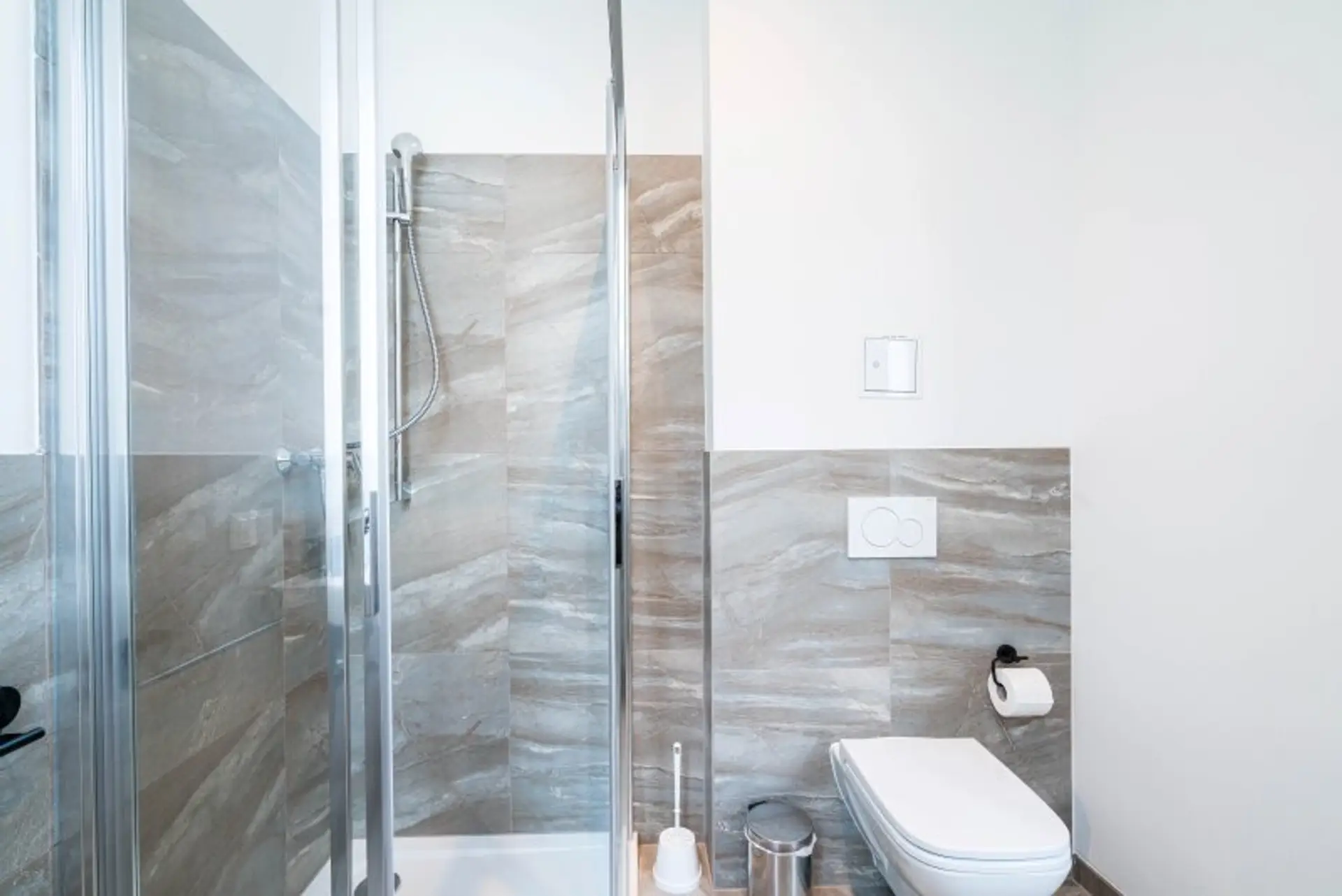 Das moderne Badezimmer ist mit Dusche und WC ausgestattet.