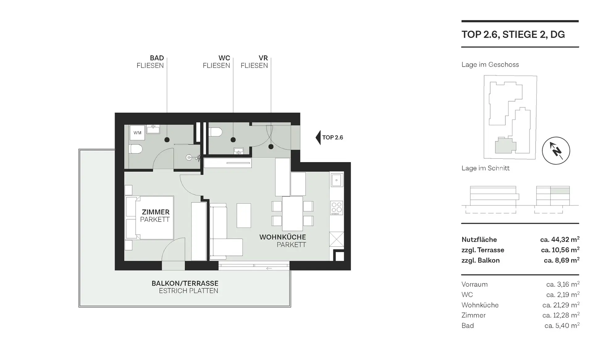 Diese 44 m² große 2-Zimmer-Einheit im Obergeschoss von Haus 2 zeichnet sich durch ihre hohe Lebensqualität und die exzellente Ausstattung aus. Eine große Terrasse mit rund 20m² erweitern den Wohnraum nach draußen. Im Inneren sorgt die ökologische Luft-Wärmepumpe für ein ganzjährig angenehmes Klima. Die hochwertigen Materialien und die massive Bauweise garantieren eine langlebige Wertbeständigkeit. In nur 25 Minuten erreichen Sie mit den öffentlichen Verkehrsmitteln den Wiener Stephansdom , während die Alte Donau als Naherholungsgebiet direkt vor Ihrer Tür liegt.