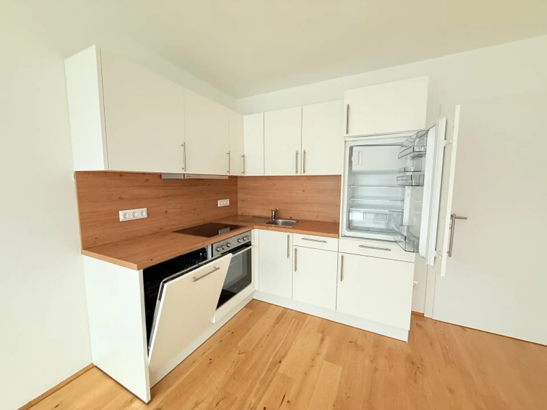 Der Küchenbereich ist mit einer modernen Hochglanz - Einbauküche ausgestattet inklusive sämtlicher Geräte (Spüle, Geschirrspüler, Cerankochfeld, Backrohr).