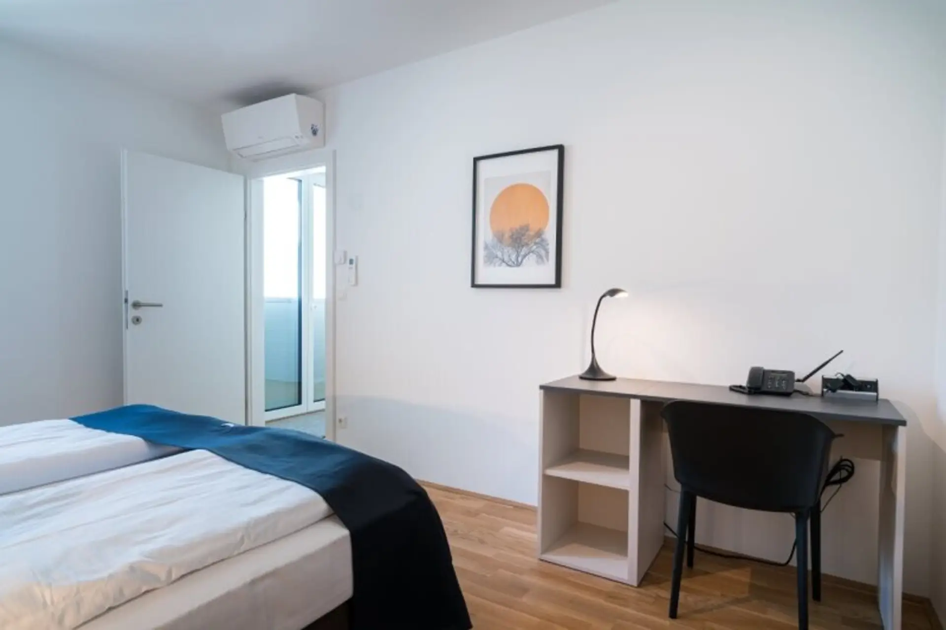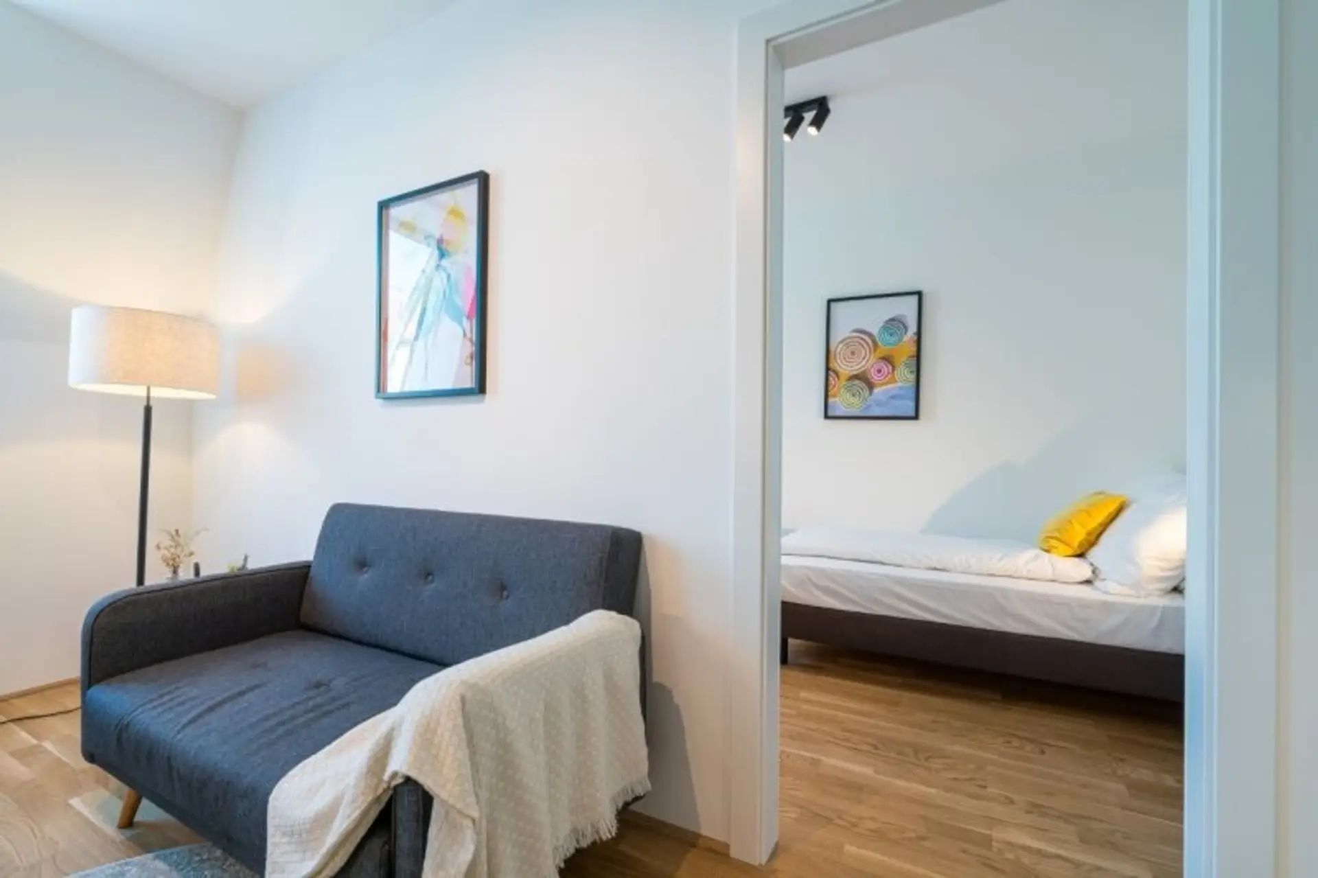 Der Wohnbereich ist offen gestaltet und integriert eine moderne Küche. Direkt angrenzend befindet sich das zweite Schlafzimmer, das flexibel als Kinderzimmer oder Arbeitszimmer genutzt werden kann.