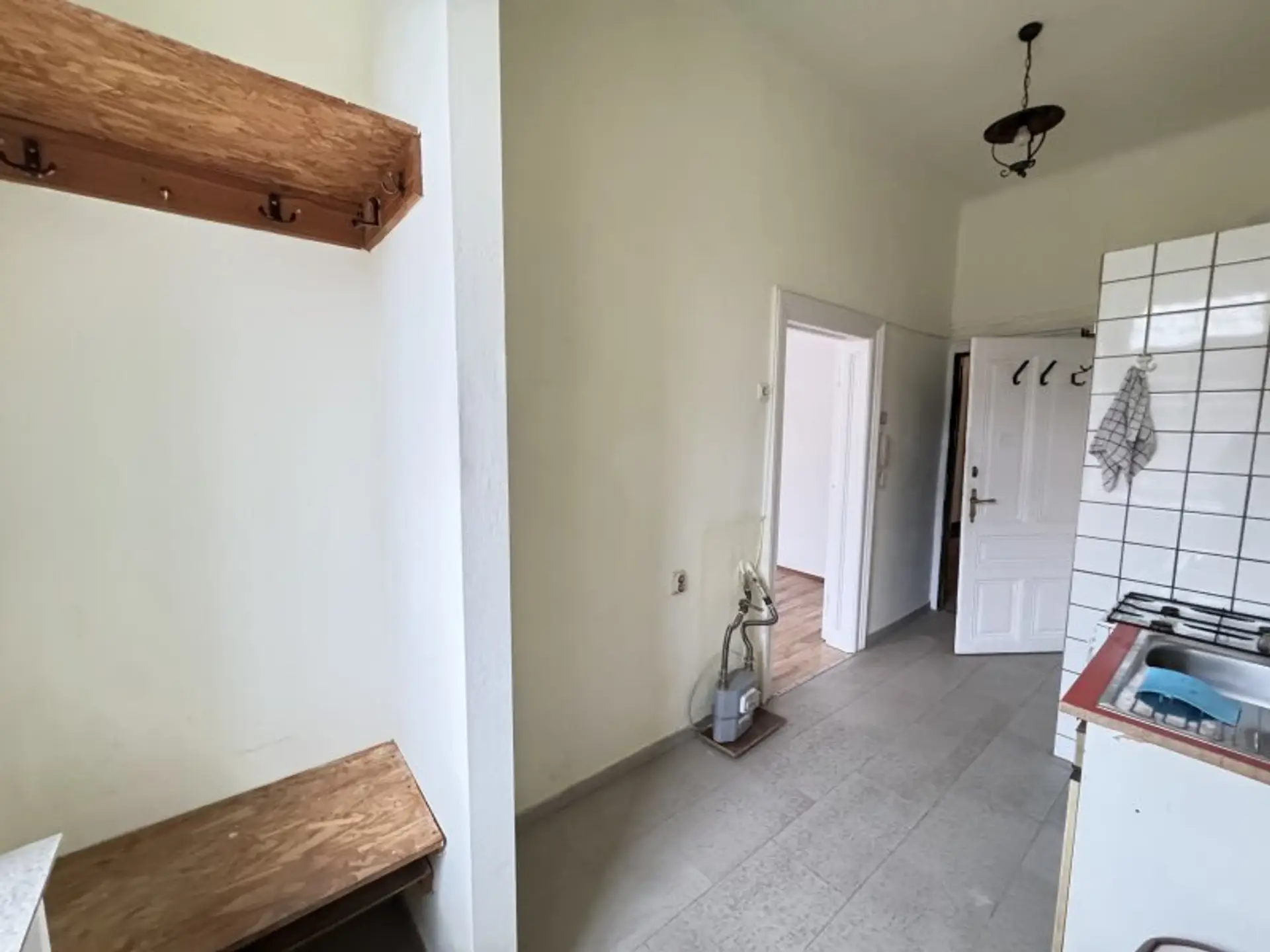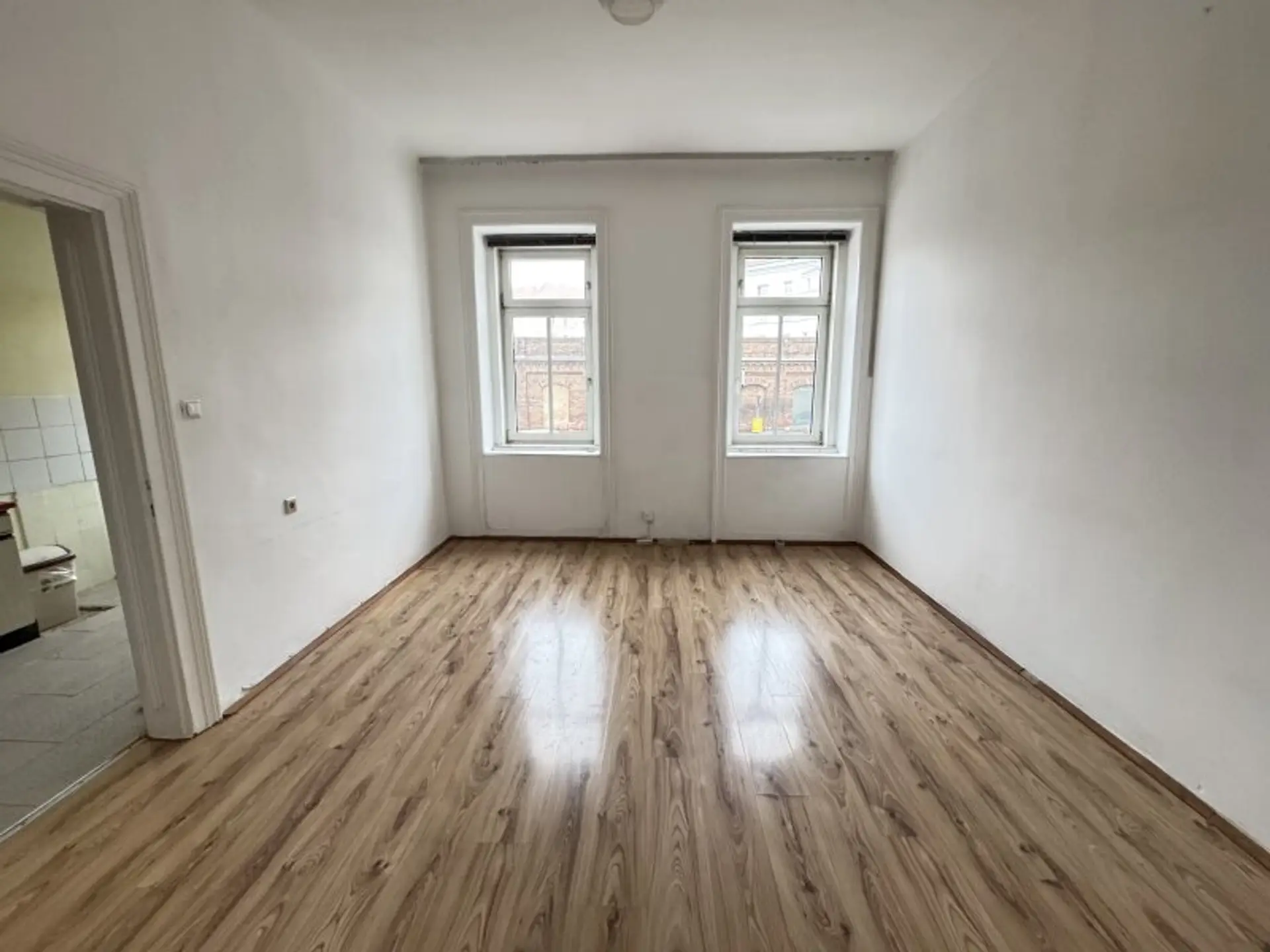 Der Grundriss umfasst ein Zimmer, einen Vorraum mit integrierter Küche, eine Dusche im Küchenbereich sowie ein separates WC innerhalb der Wohnung. Aktuell sind Laminat- und Fliesenböden verlegt. Eine Heizungsanlage ist derzeit nicht vorhanden, wodurch sich im Zuge einer Sanierung individuelle Lösungen umsetzen lassen.