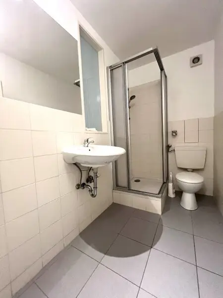 - Badezimmer mit Dusche, Waschbecken mit Spiegel, WC, Waschmaschinenanschluss an Waschbecken
